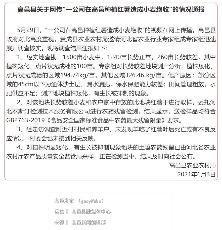通报称,5月29日,“一公司在高邑种植红薯造成小麦绝收”的视频在网上传播。高邑县政府对此高度重视,责成县农业农村局邀请河北省农业行业专家组成专家组迅速展开调查核实。现将调查结果通报如下: