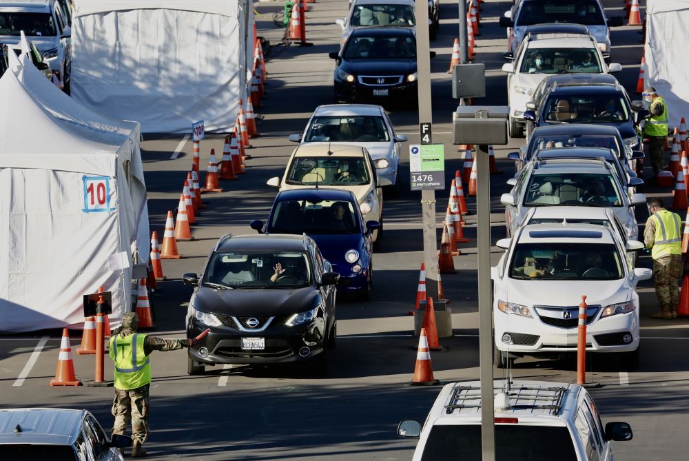 图为2月22日,民众驾车来到美国加州大学洛杉矶分校的一处疫苗中心准备接种新冠疫苗。(新华社发)