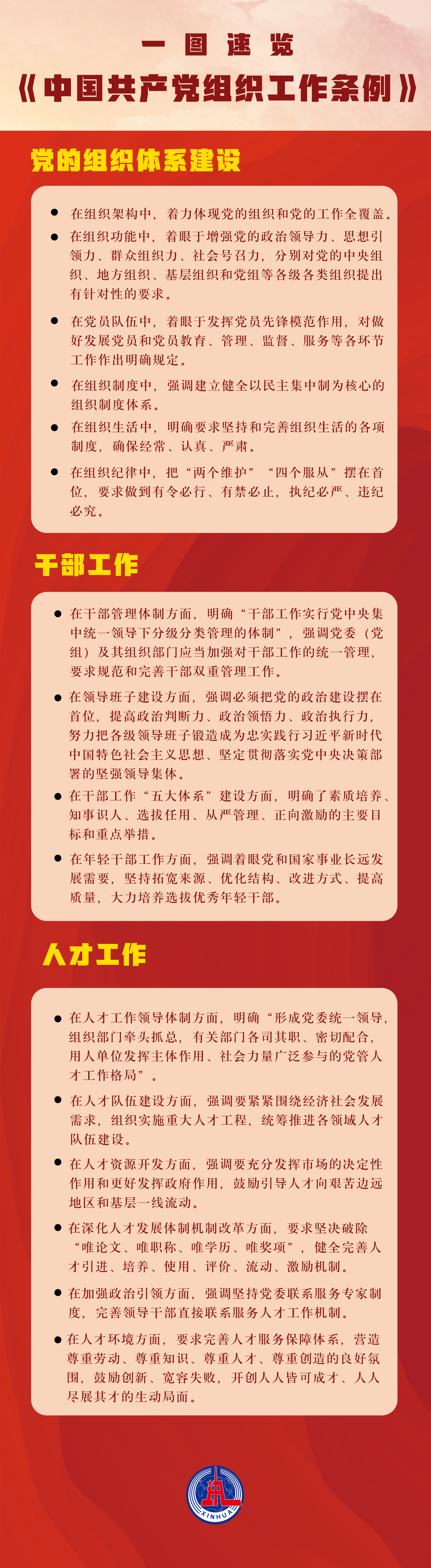 近日,中共中央印发《中国共产党组织工作条例》。条例是党的历史上第一部关于组织工作的统领性、综合性基础主干法规,是做好新时代党的组织工作、加强党的组织建设的基本遵循。条例在党的组织体系建设、干部工作、人才工作等方面都提出了要求。欲知详情,请戳大图——