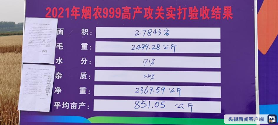 根据农业农村部《全国粮食高产创建测产验收办法(试行)》,最终结果显示,2.7843亩的收获面积,小麦净重达2369.59公斤,平均亩产851.05公斤。相比去年的亩产819.85公斤,每亩增产超过31公斤,再次刷新安徽小麦平均亩产新纪录。