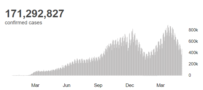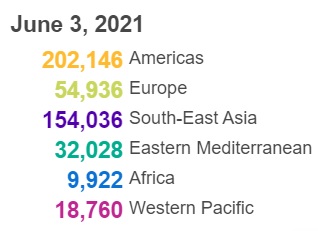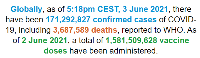 根据世卫组织最新实时统计数据,截至欧洲中部夏令时间6月3日17时18分(北京时间6月3日23时18分),全球累计新冠肺炎确诊病例171292827例,累计死亡病例3687589例,3日全球新冠肺炎确诊病例新增471828例。(总台记者 朱赫)