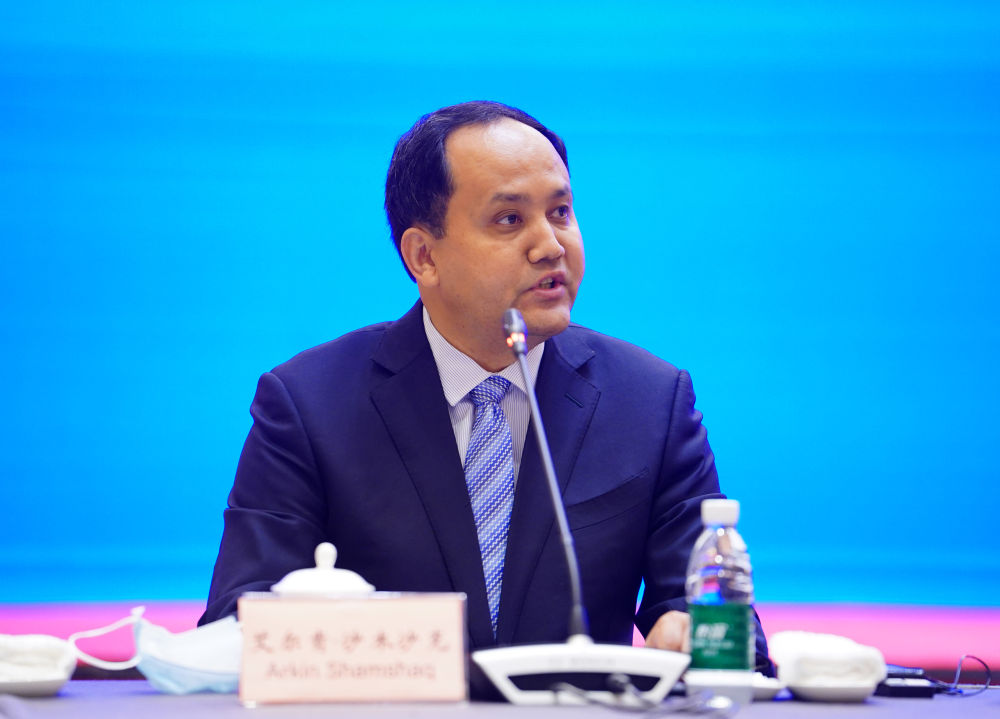 6月3日,新疆大学法学院副院长、副教授艾尔肯·沙木沙克在介绍情况。当日涉疆问题新闻发布会在北京举行。( 新华社记者邢广利摄)
