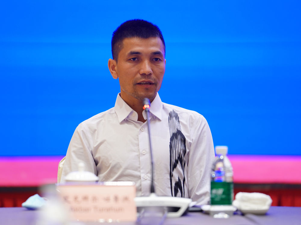 6月3日,新疆阿克苏华孚色纺有限公司员工艾克拜尔·吐鲁洪在介绍情况。当日涉疆问题新闻发布会在北京举行。(新华社记者邢广利摄)