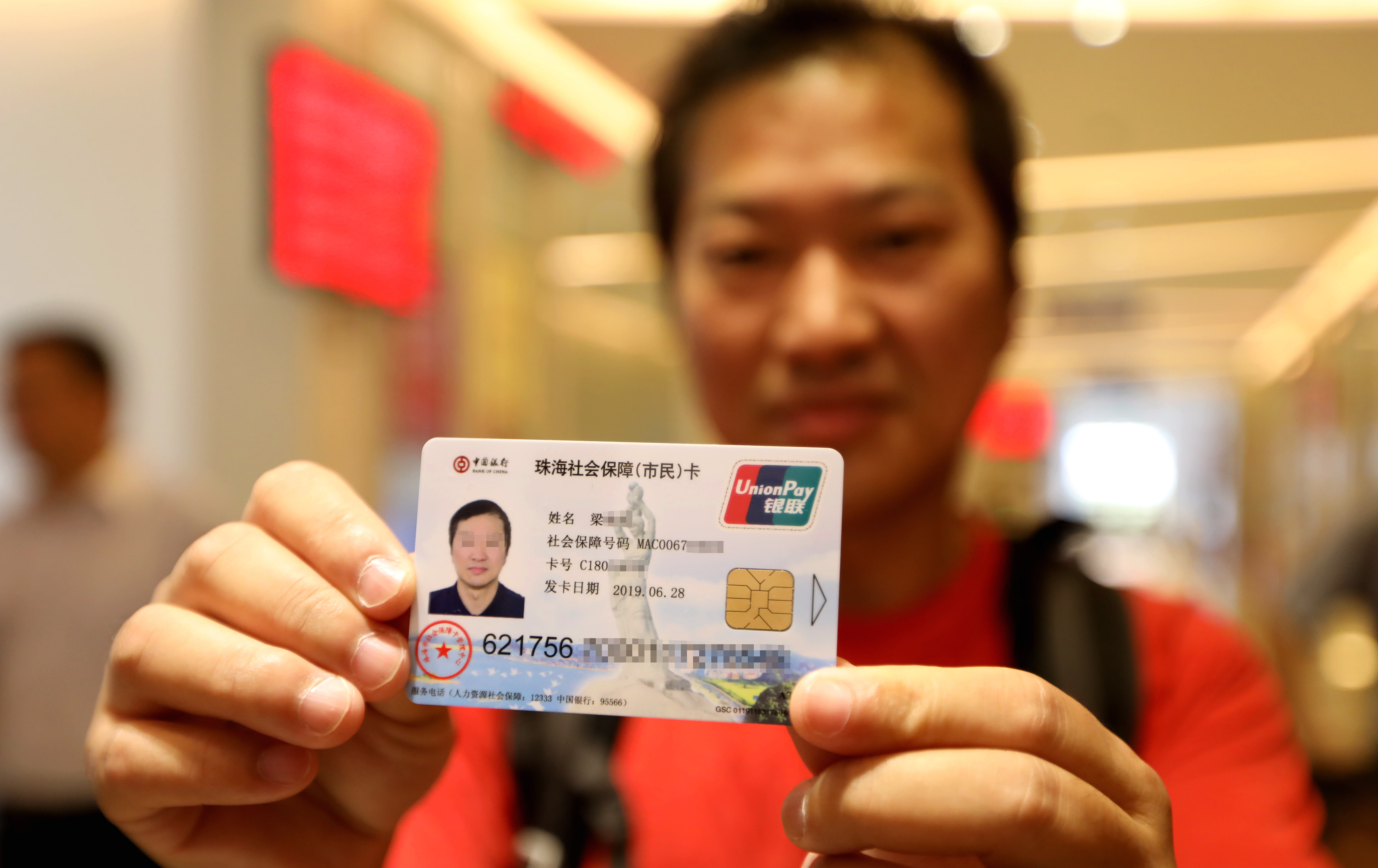 图为澳门居民喜领有医保功能的珠海社保卡。李建束摄
