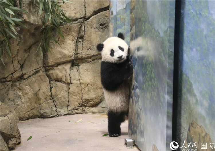 “小奇迹”在熊猫馆内玩耍。人民网记者 李志伟摄