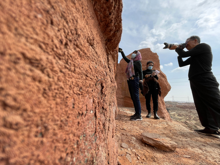 在位于靖远黄河之滨的“大兵道古道遗址”,红色山体上散落着不同时期的古岩画,反映了古代北方游牧民族生产生活的历史场景和民风民俗。