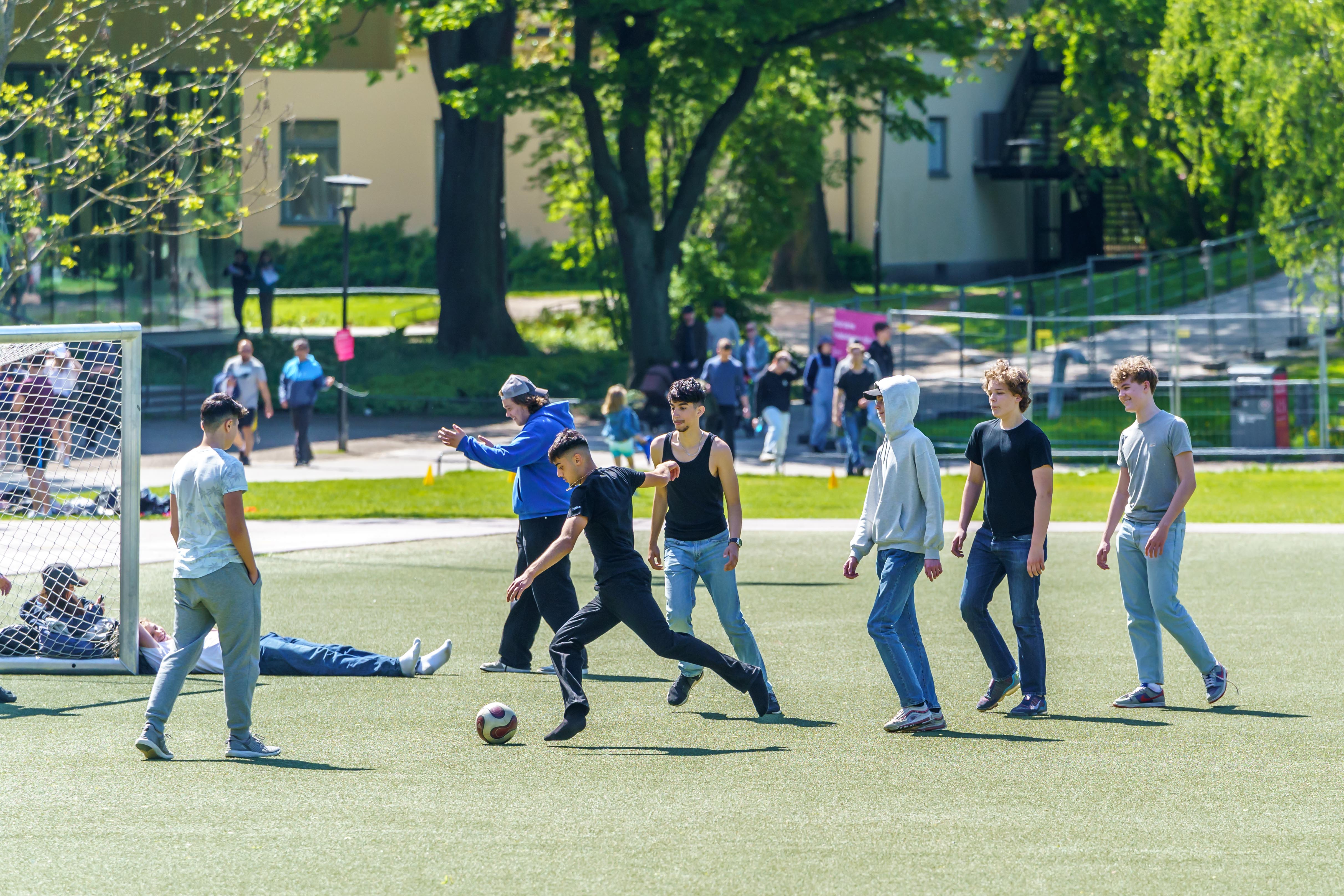 6月1日,青少年在瑞典斯德哥尔摩一处公园踢足球。新华社发(魏学超摄)