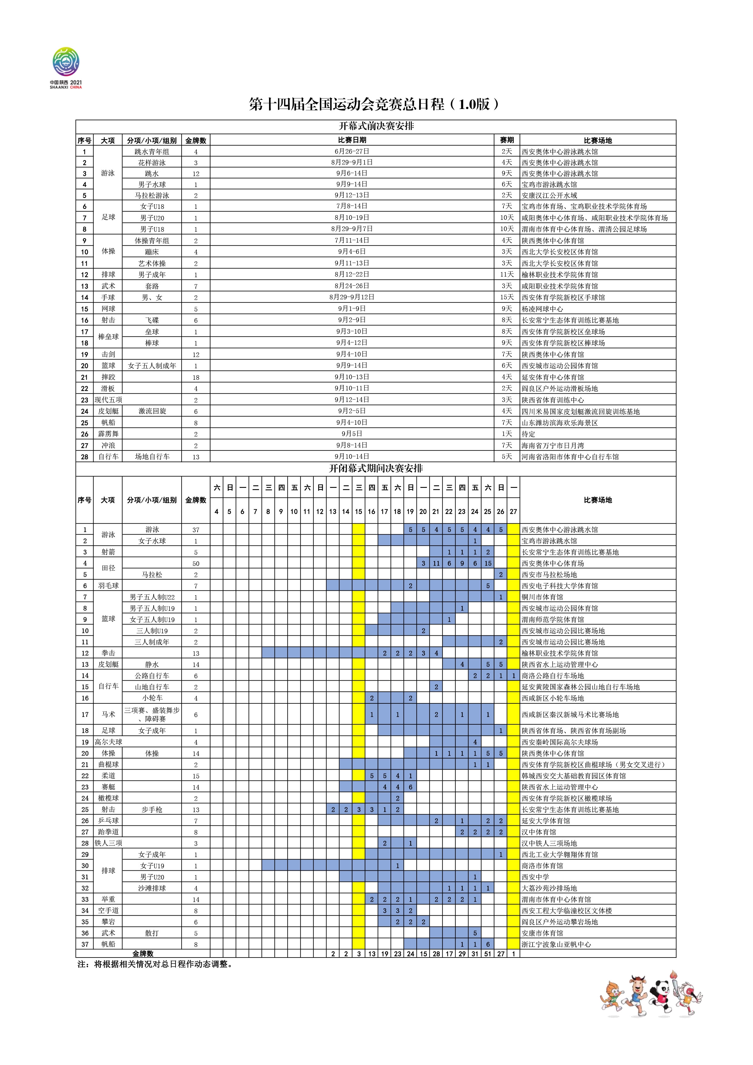 6月3日,国家体育总局发布第十四届全国运动会竞赛总日程(1.0版)。十四运会开幕式前将进行游泳、足球、体操、棒垒球等19个大项,开闭幕式期间将进行游泳、田径、篮球、排球等26个大项的比赛。同时,国家体育总局将根据疫情防控工作需要,动态调整竞赛日程。