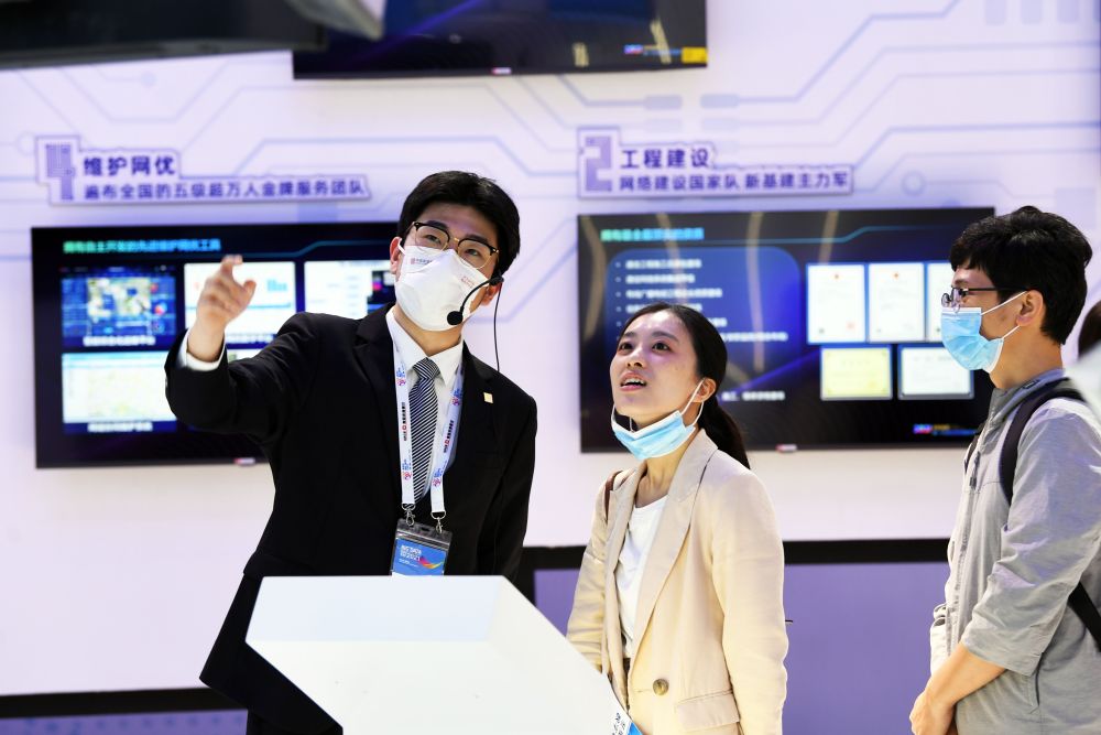 5月26日,在2021中国国际大数据产业博览会上,参展商为观众讲解数字新基建成果。图片由2021中国国际大数据产业博览会新闻中心提供