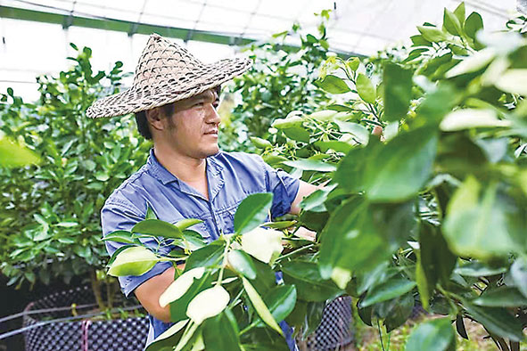 ↑田生科在观察柑橘长势。王敏智摄