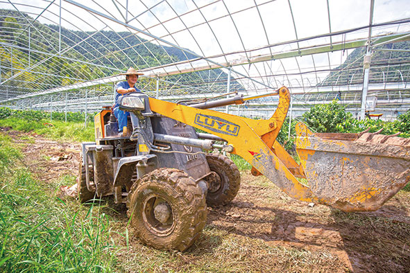 ↑田生科驾驶铲车在柑橘大棚里劳动。王敏智摄