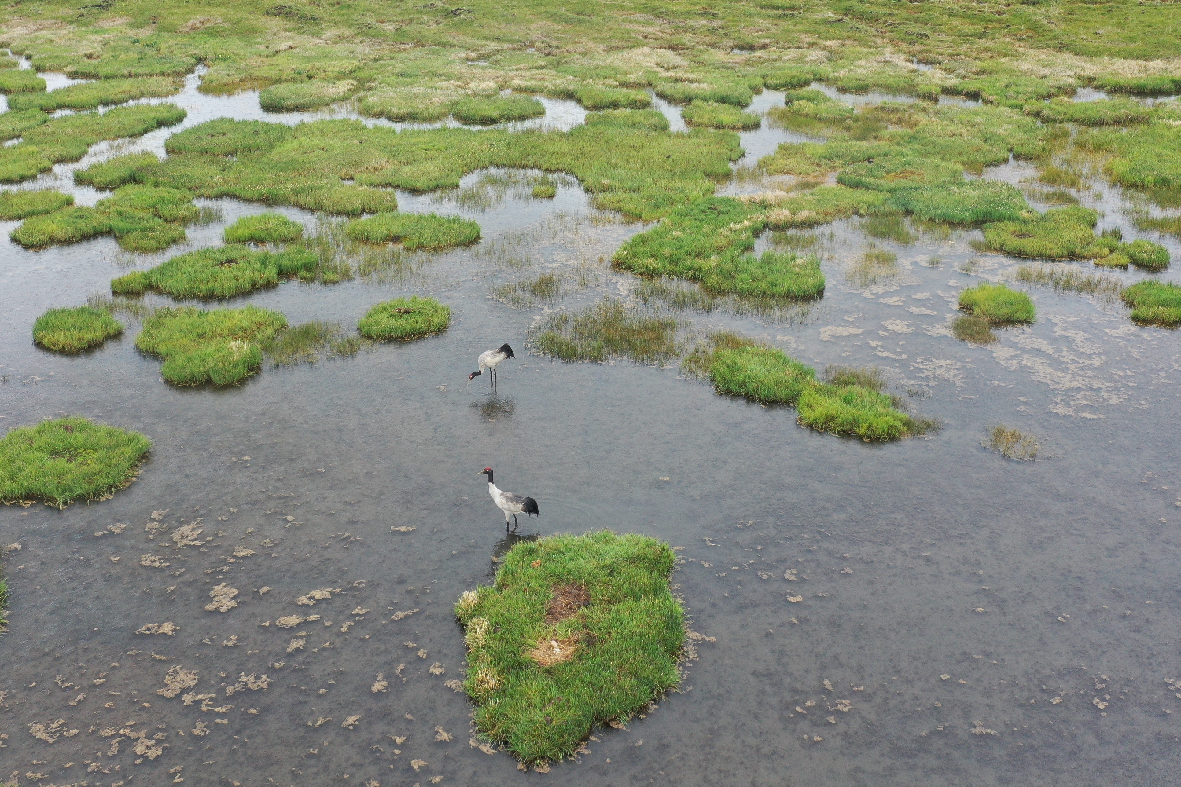 黑颈鹤在巢附近守护(无人机照片)。新华社记者杜哲宇 摄