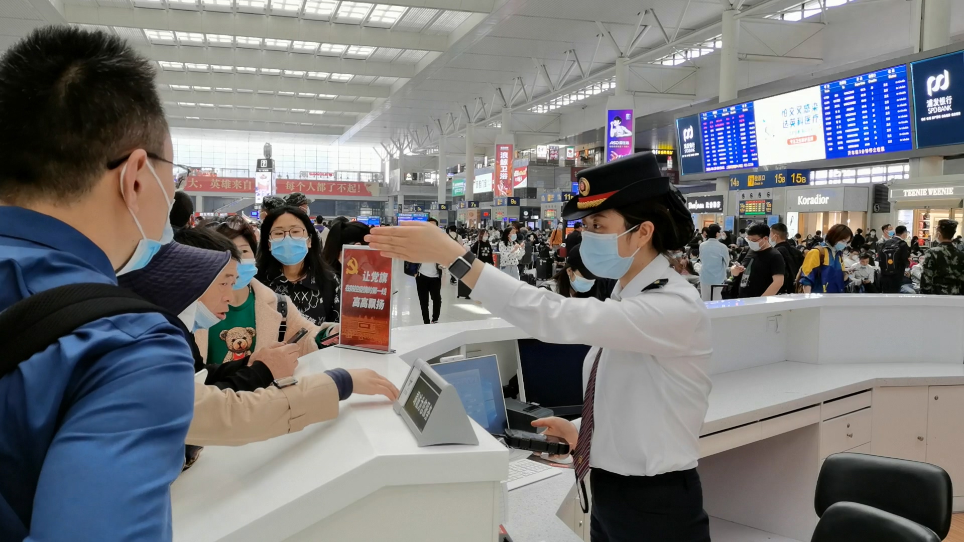 上海虹桥站12306服务站工作人员为旅客提供咨询服务。(上海虹桥站 供图)