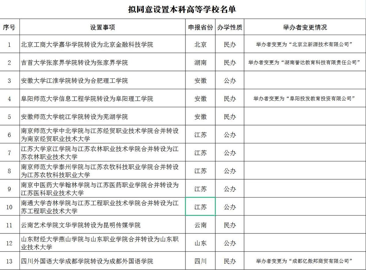 6月4日消息,教育部网站今日发布关于拟同意设置本科高等学校的公示,消息指出,拟同意北京工商大学嘉华学院等13所独立学院转设为独立设置的本科学校,现将学校名单等信息向社会公示。