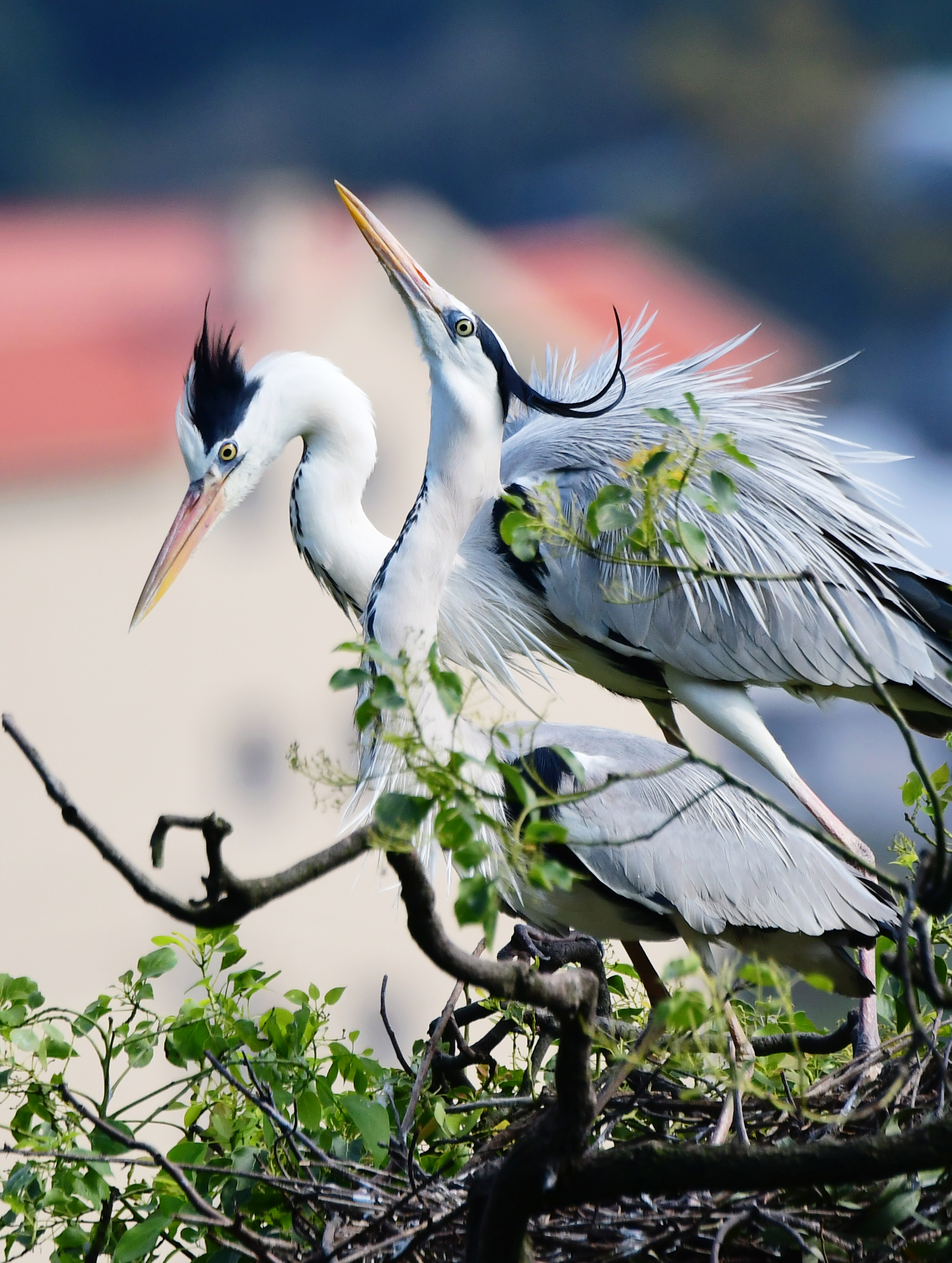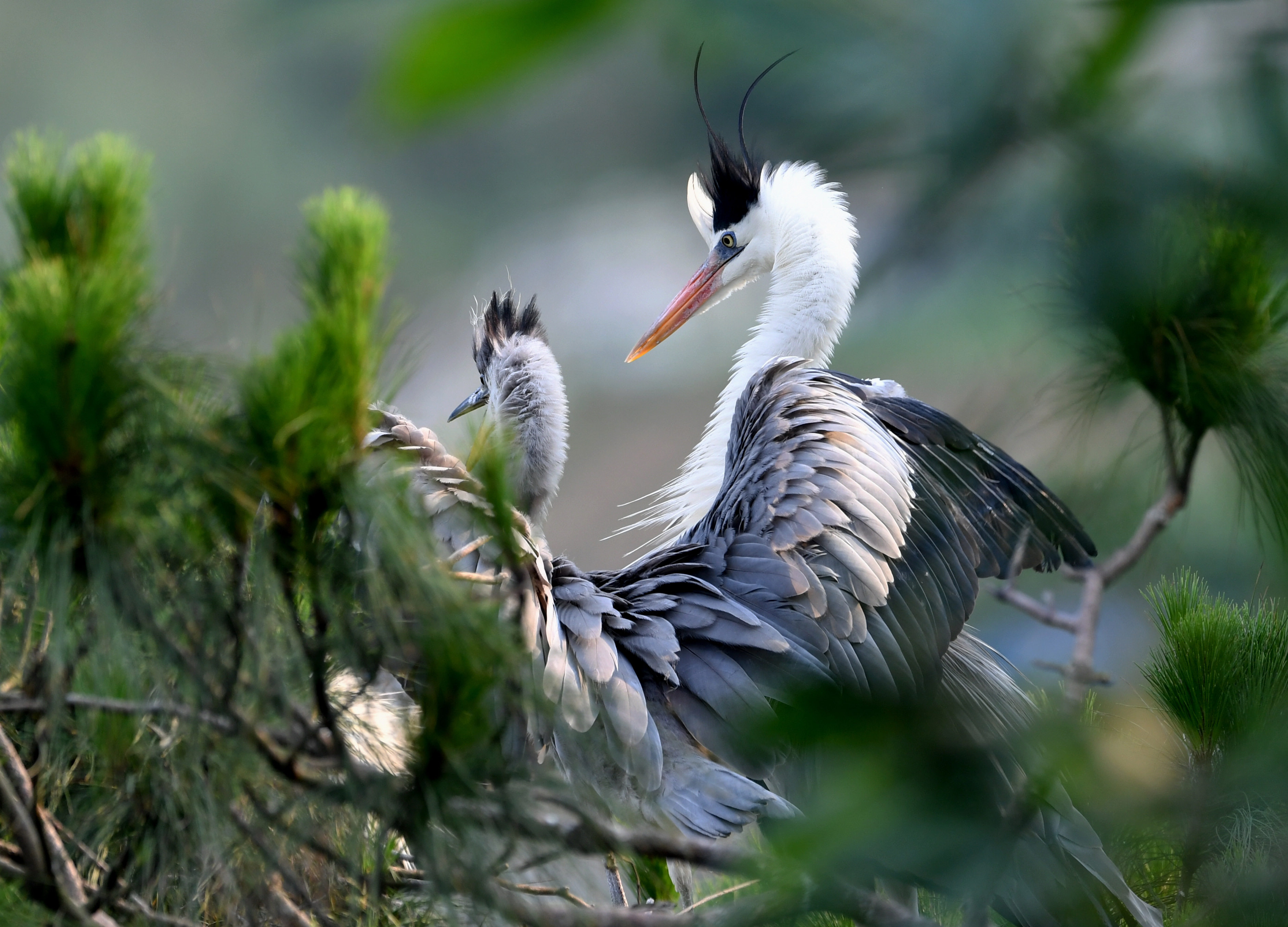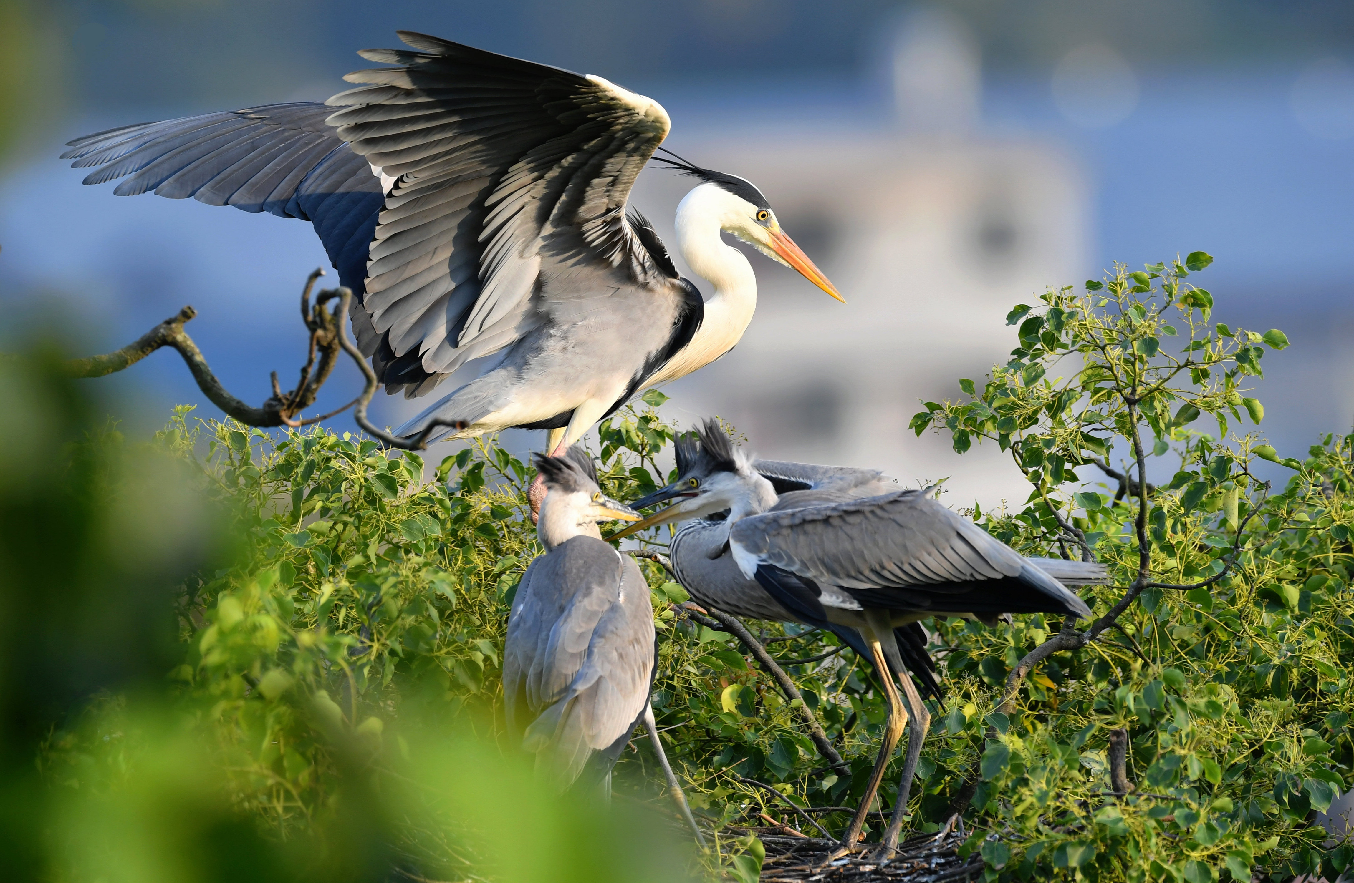 ↑在树上筑巢栖息的苍鹭(6月3日摄)。