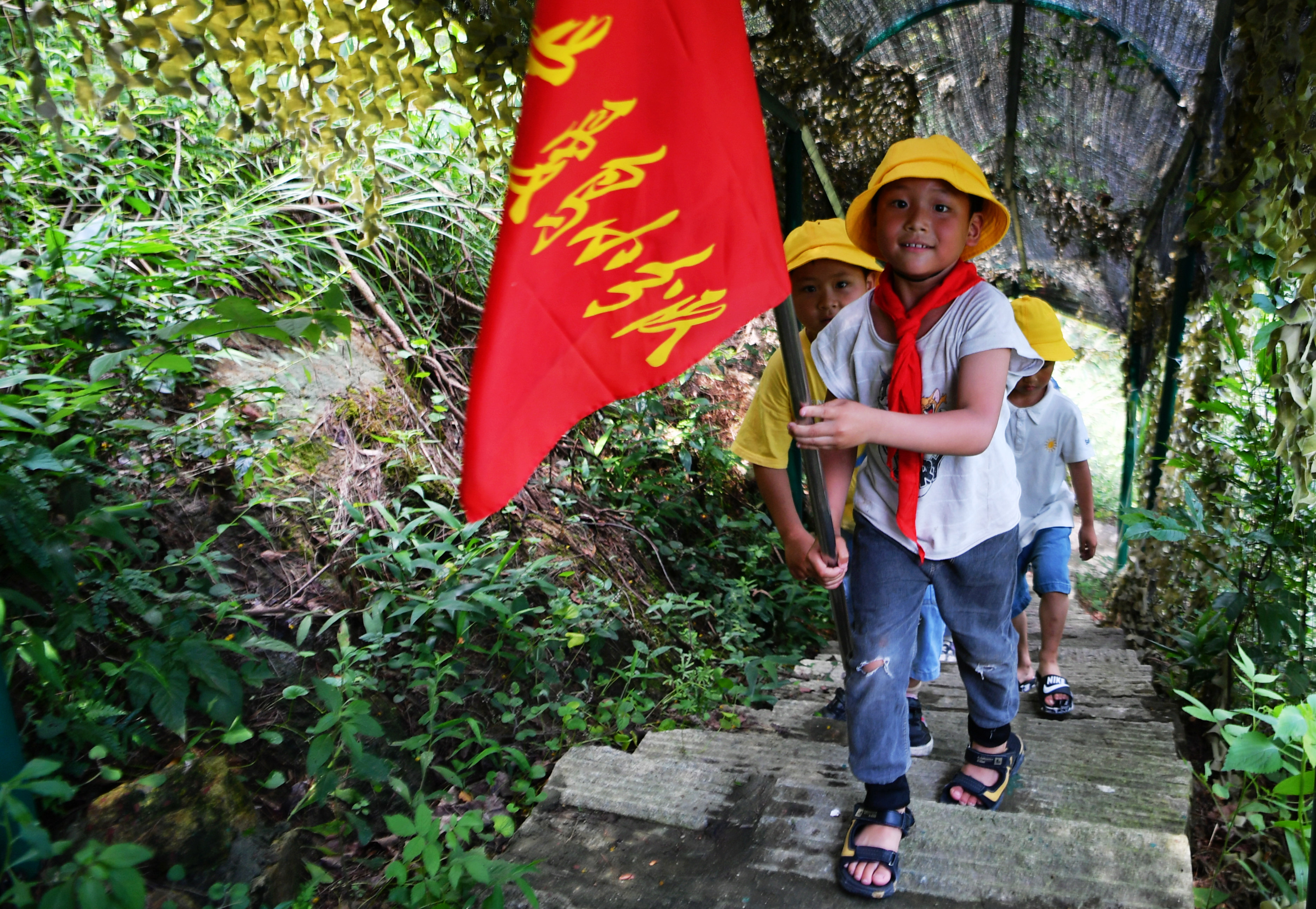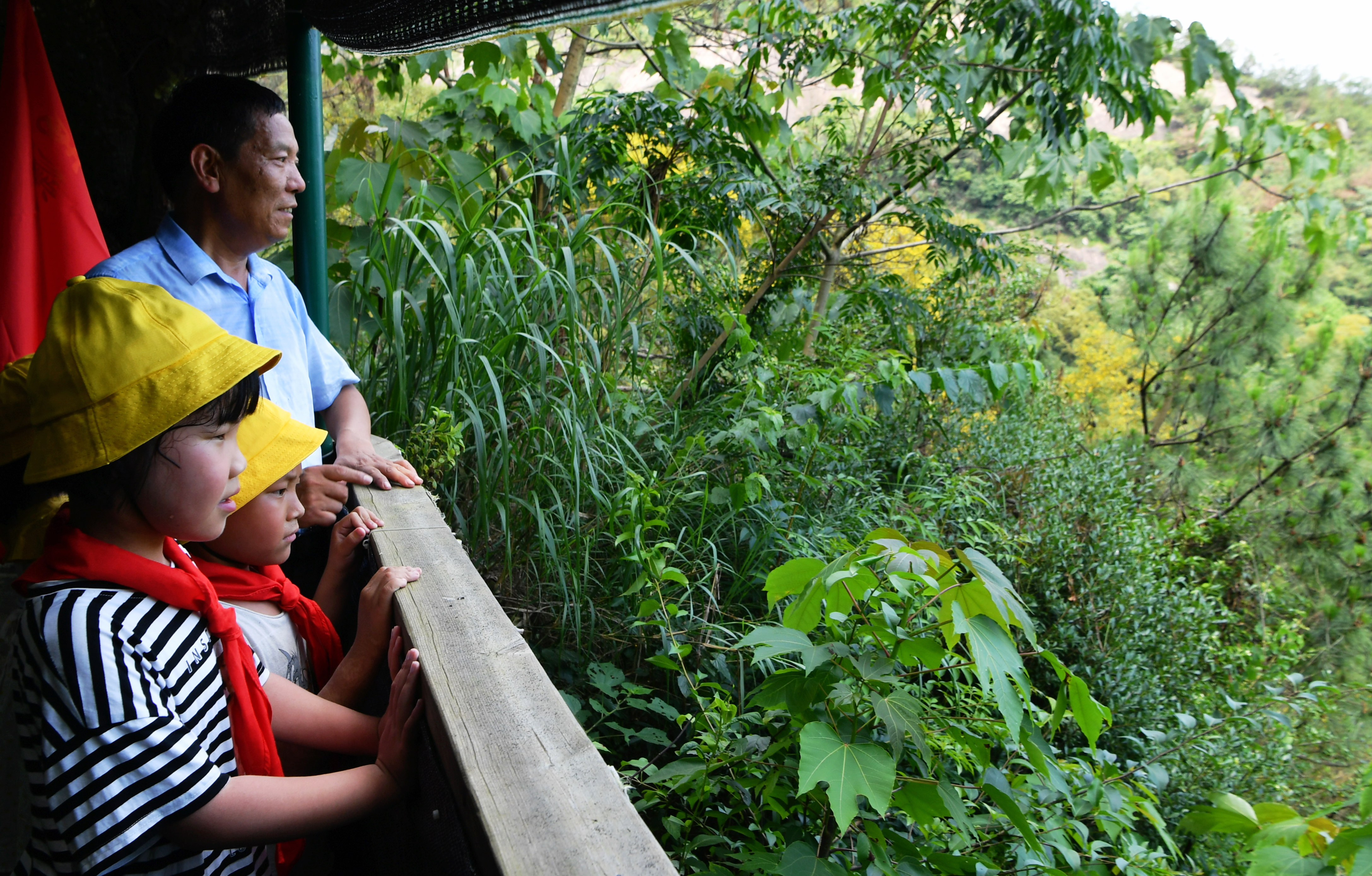 ↑罗源县濂澳小学的爱鸟小分队在老师的带领下,来到观鸟点观赏苍鹭(6月3日摄)。