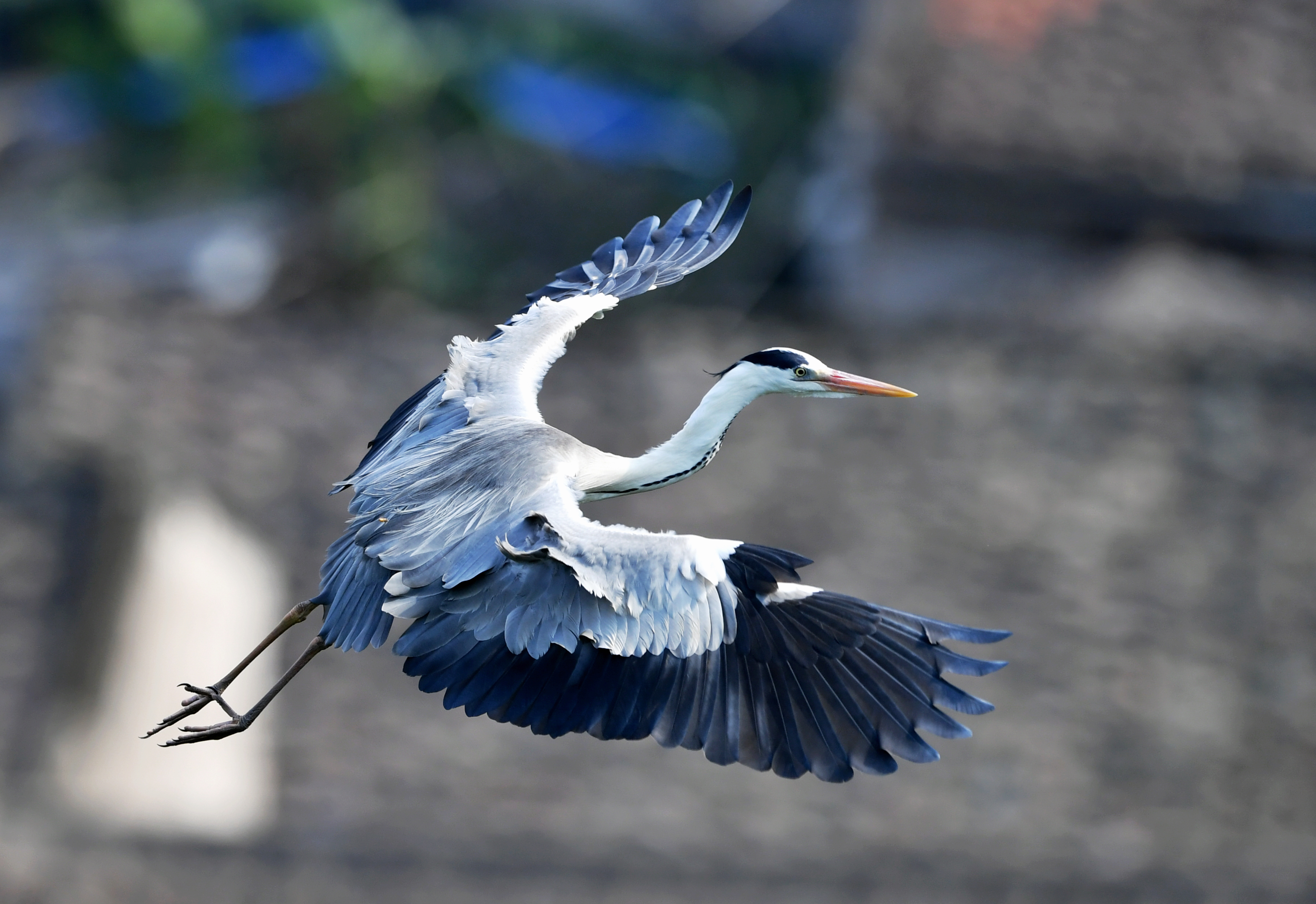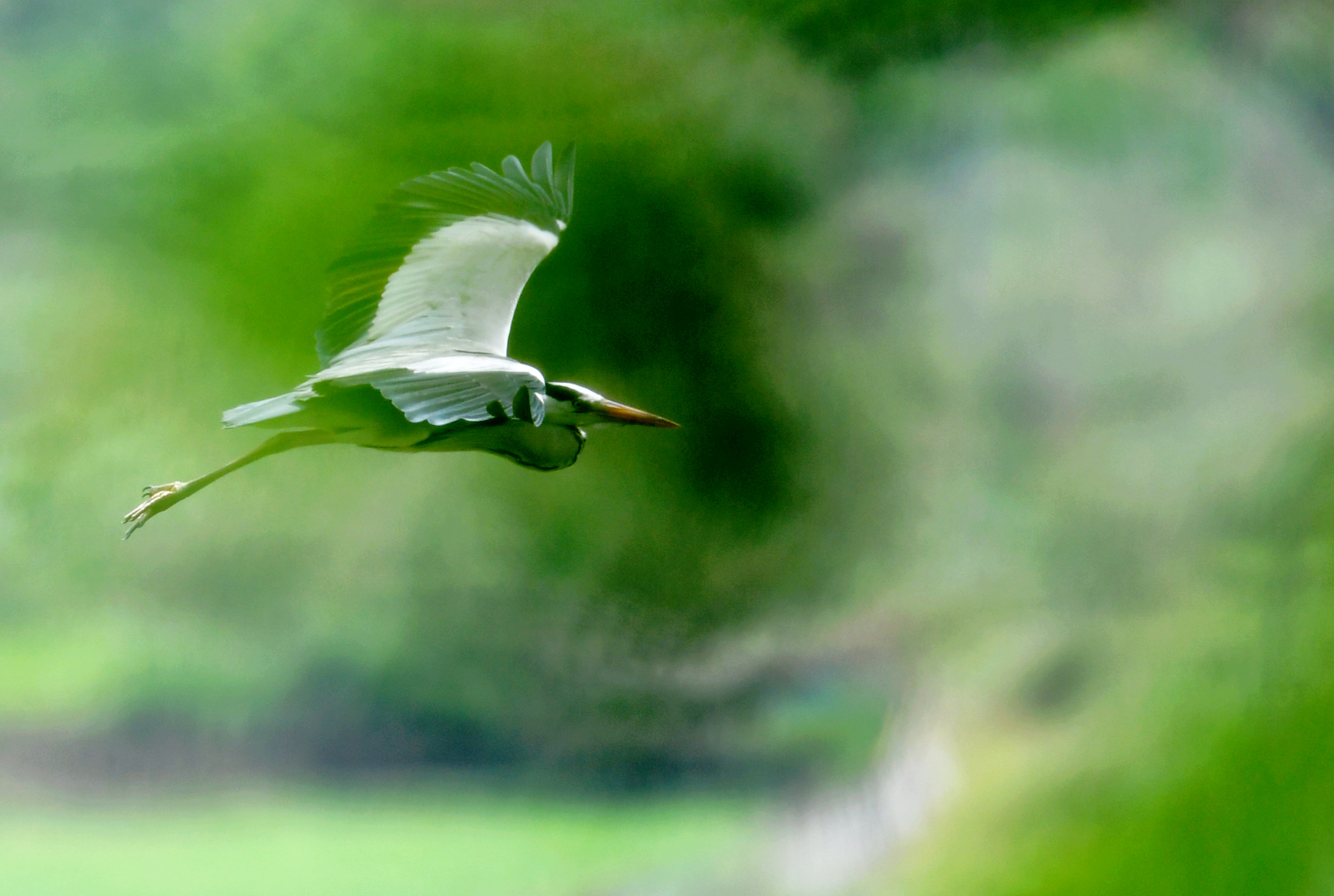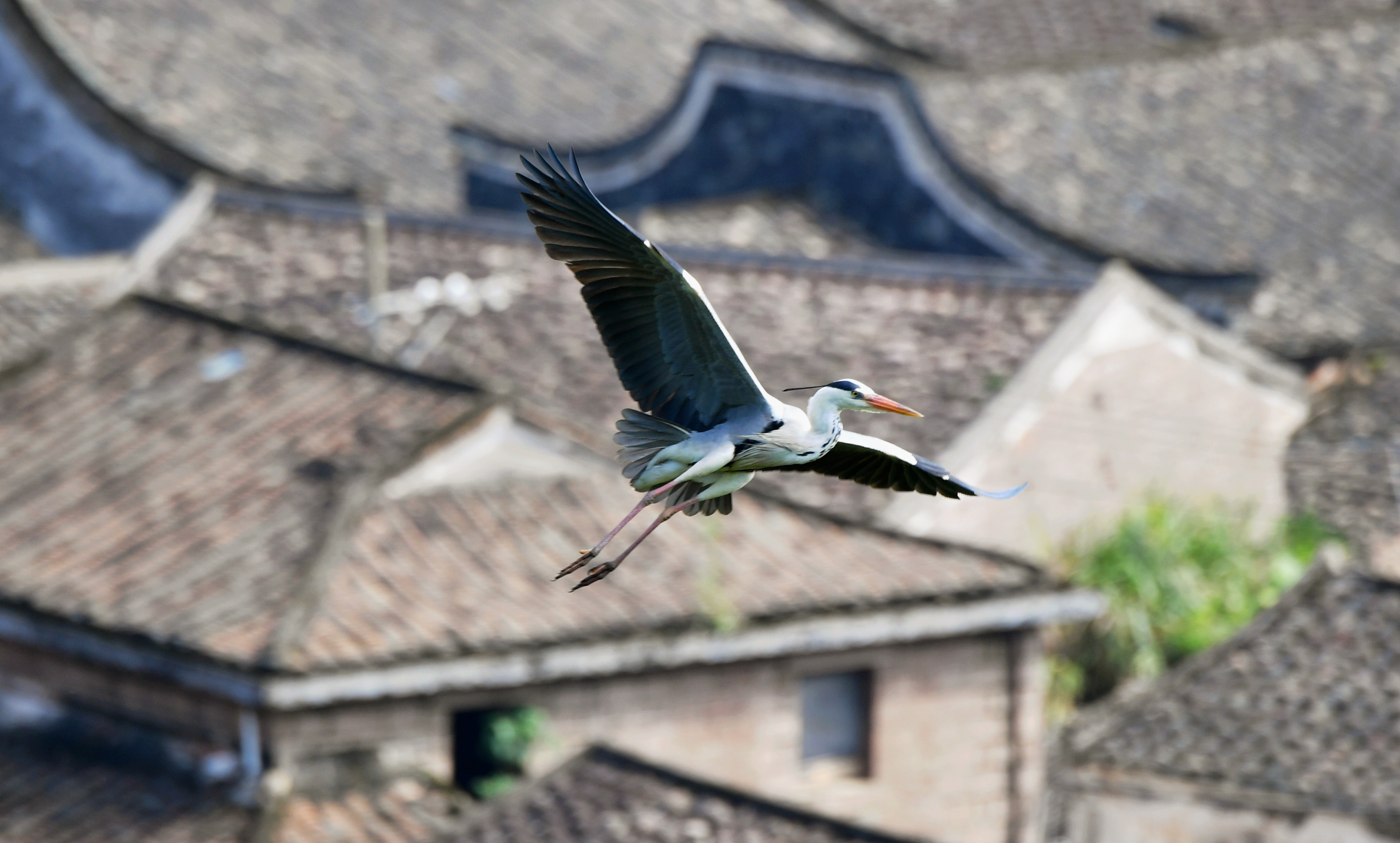↑一只苍鹭在濂澳村上空展翅飞翔(6月3日摄)。