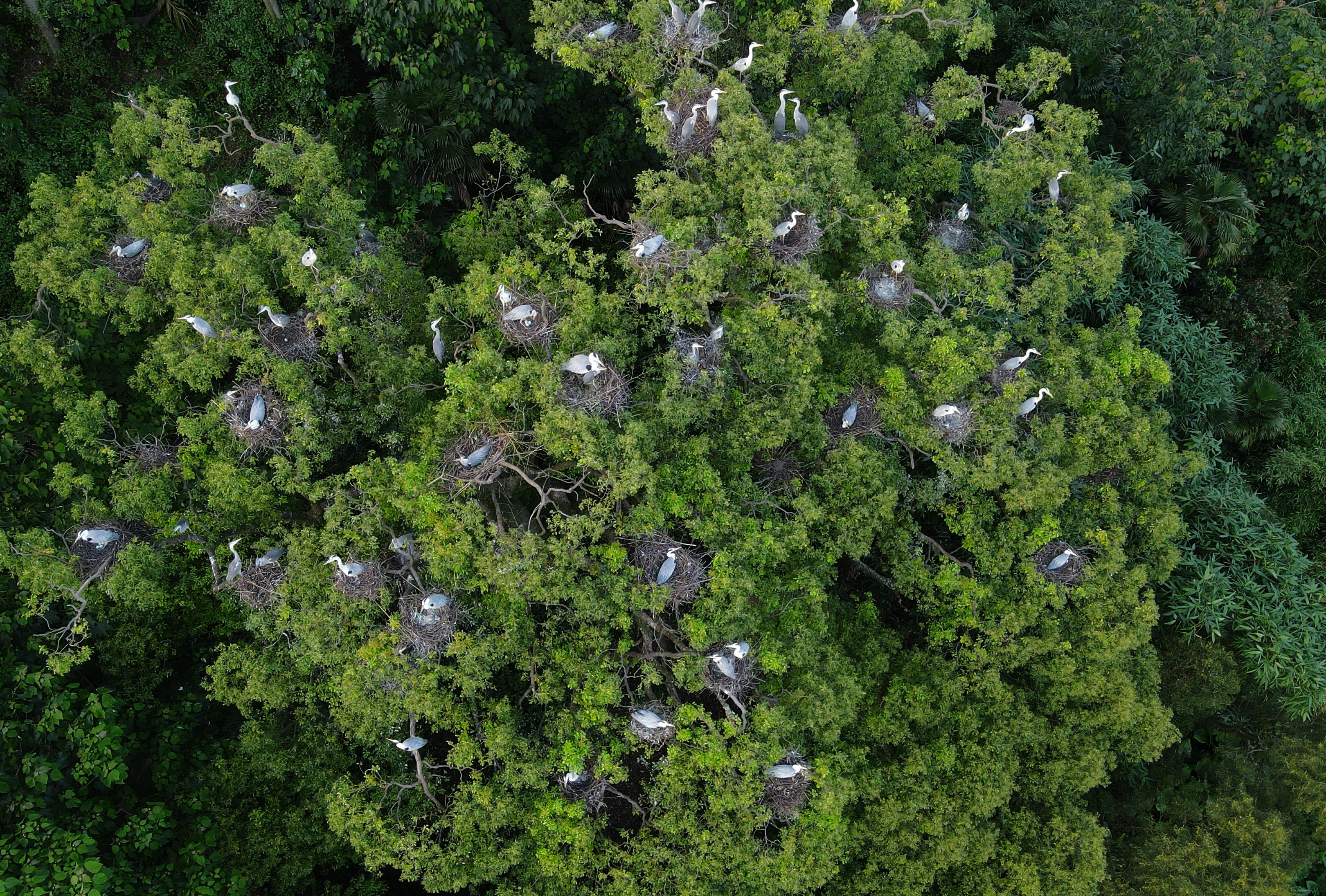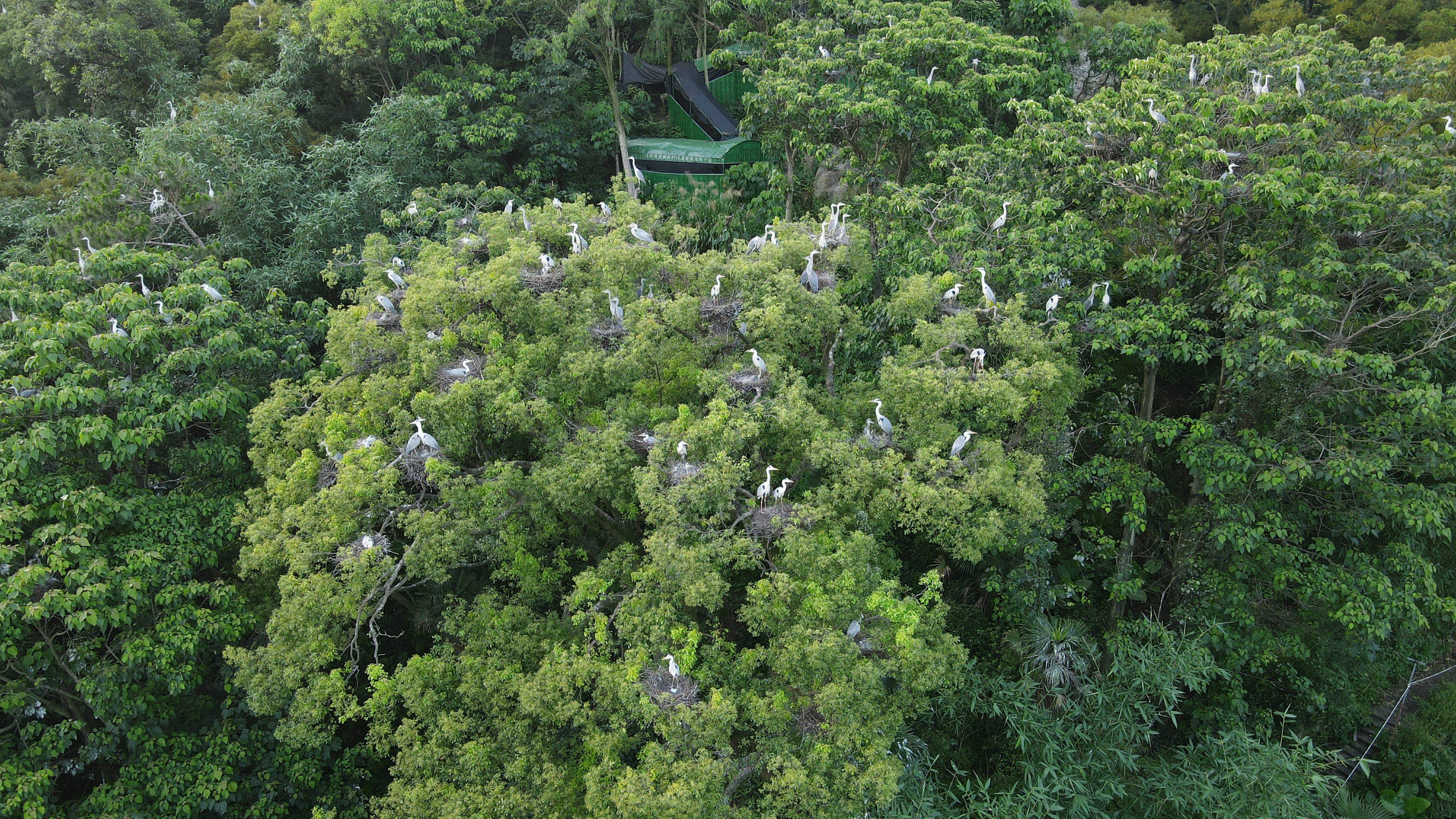 ↑这是罗源县碧里乡濂澳村后山茂密的树林,成群的苍鹭在树上筑巢栖息(6月3日摄,无人机照片)。