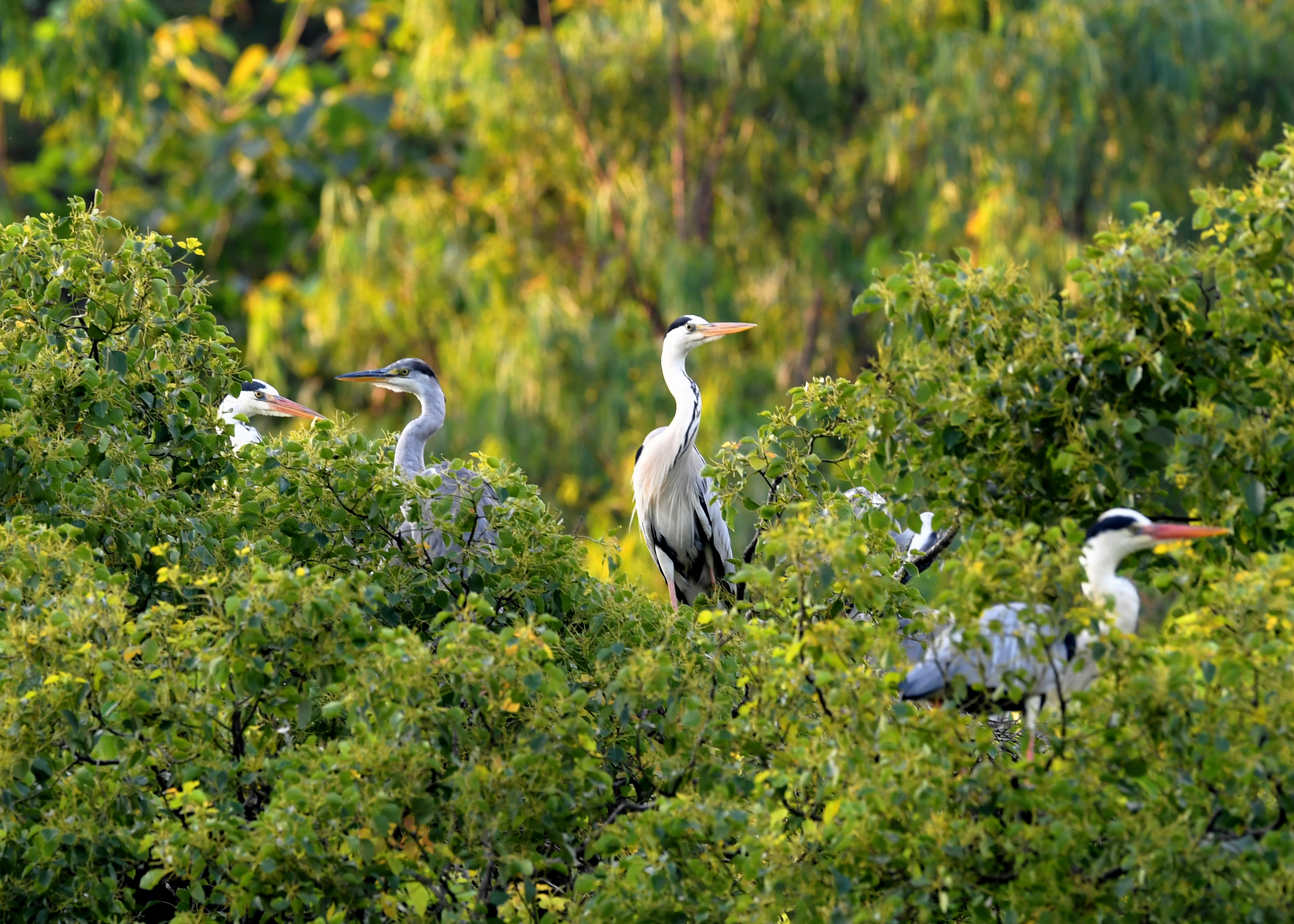 ↑成群的苍鹭在树上筑巢栖息(6月3日摄)。