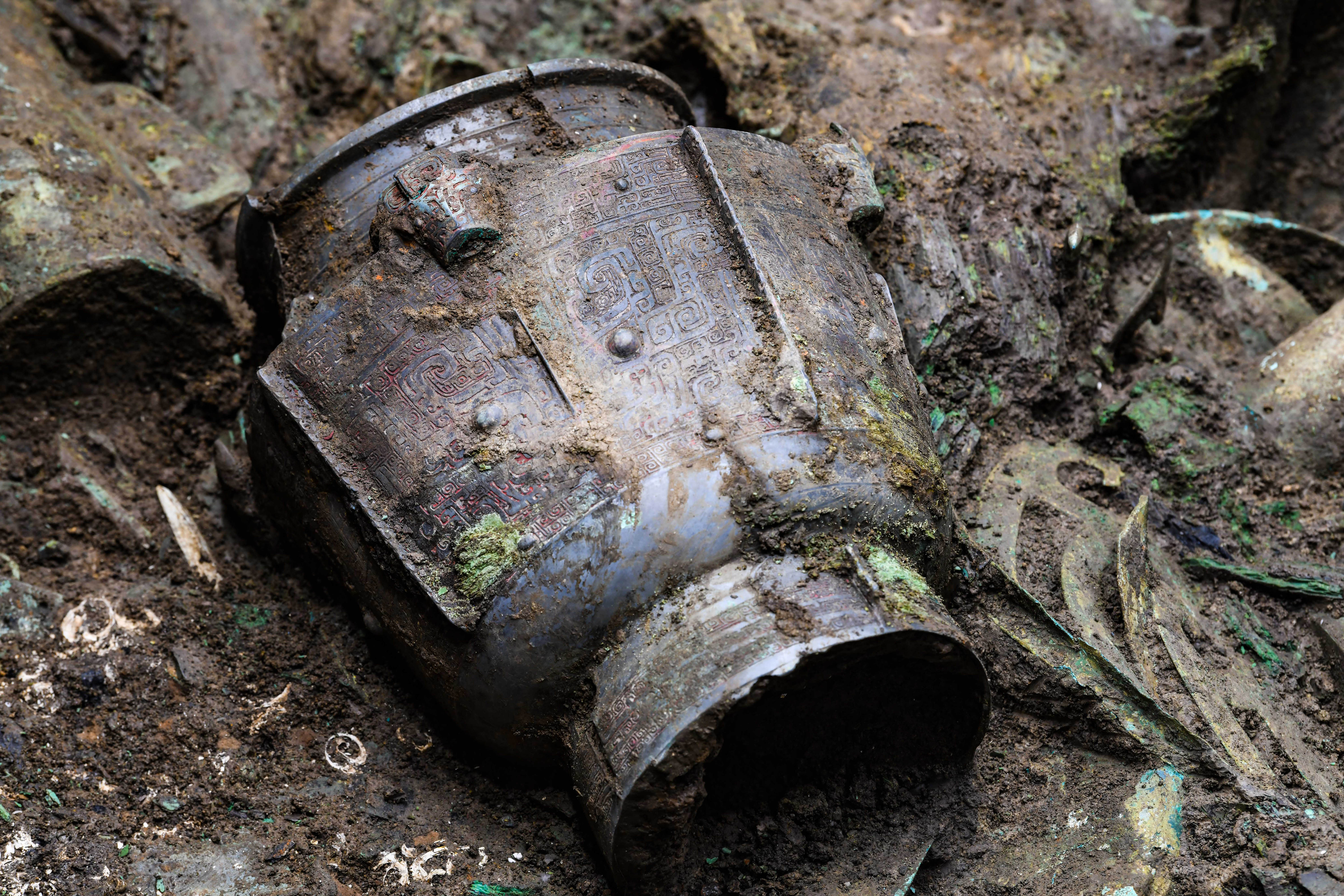 这是2021年5月14日在三星堆考古发掘现场3号“祭祀坑”拍摄的青铜器。新华社记者 王曦 摄