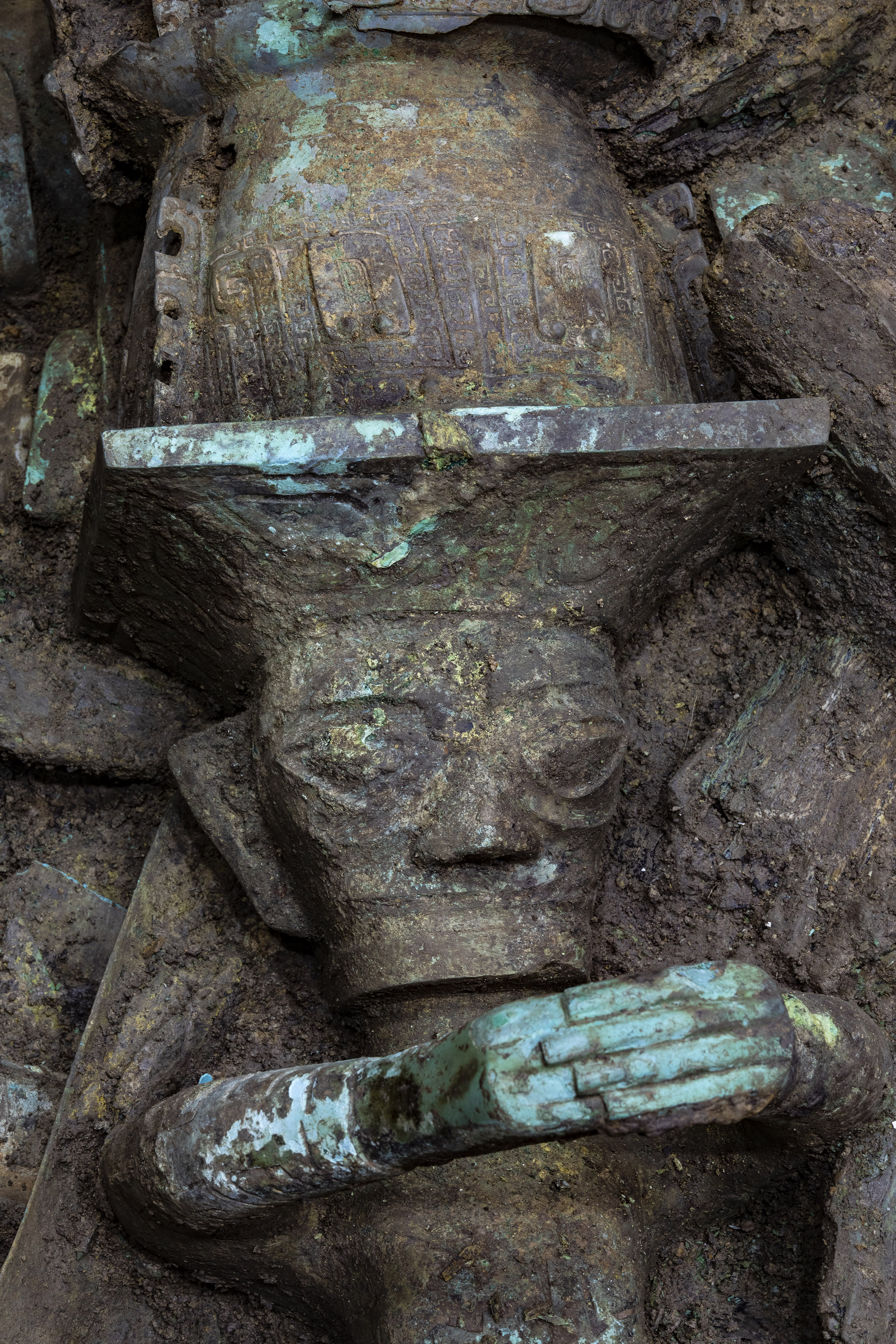 “30多年前,二号‘祭祀坑’曾出土一件通高15厘米的顶尊跪坐人像,但接近真实比例的顶尊跪坐人像则属首次发现。”北京大学考古文博学院党委书记陈建立说,这件尊的形制、技法与纹样和同时期长江流域、中原地区的铜尊相似,但将人像与尊组合为一体的造型,属古蜀文明原创,体现了地域文化特性。