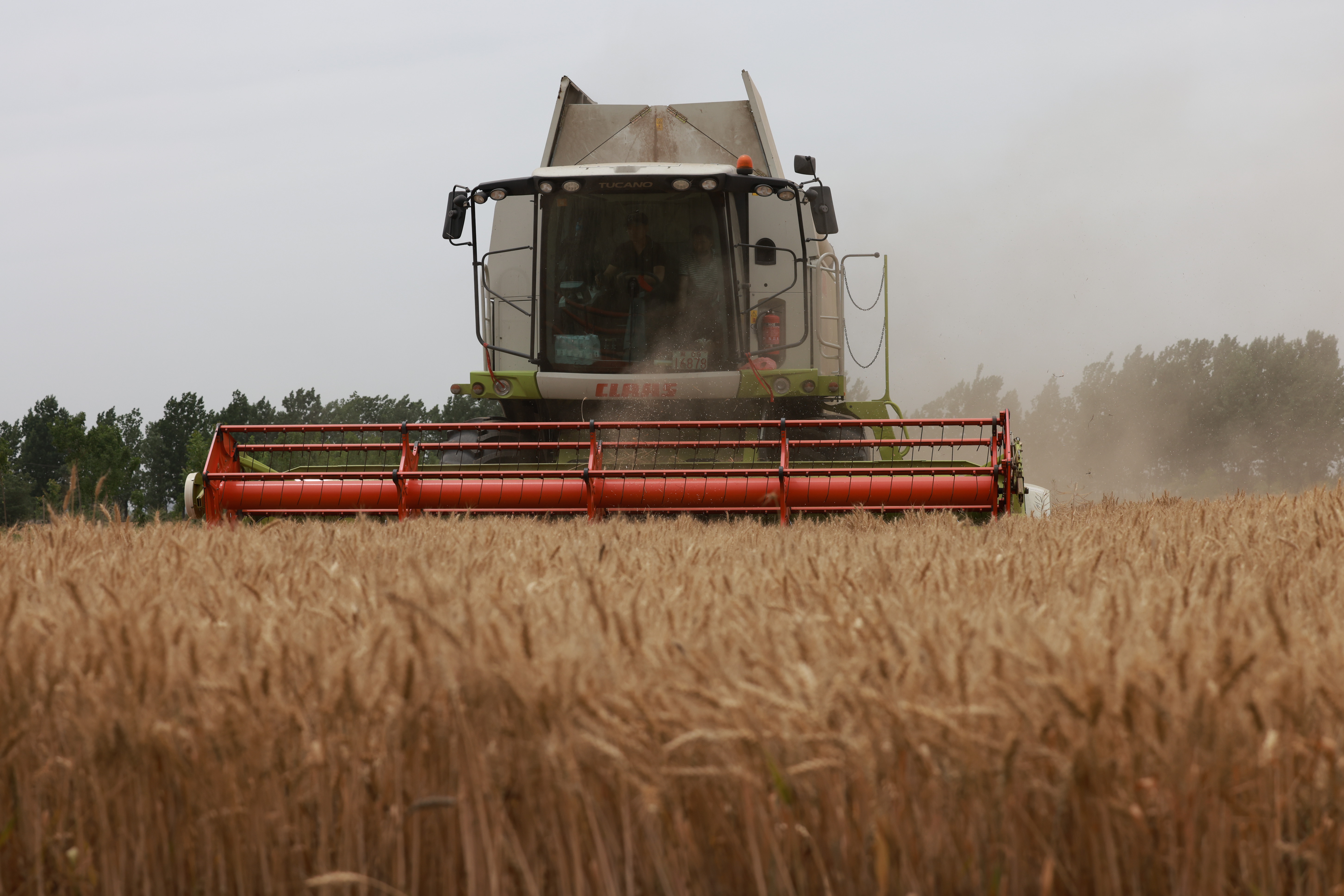 2021年5月27日,在河南省宝丰县的一处麦田里,收割机在工作。新华社记者 许雅楠 摄