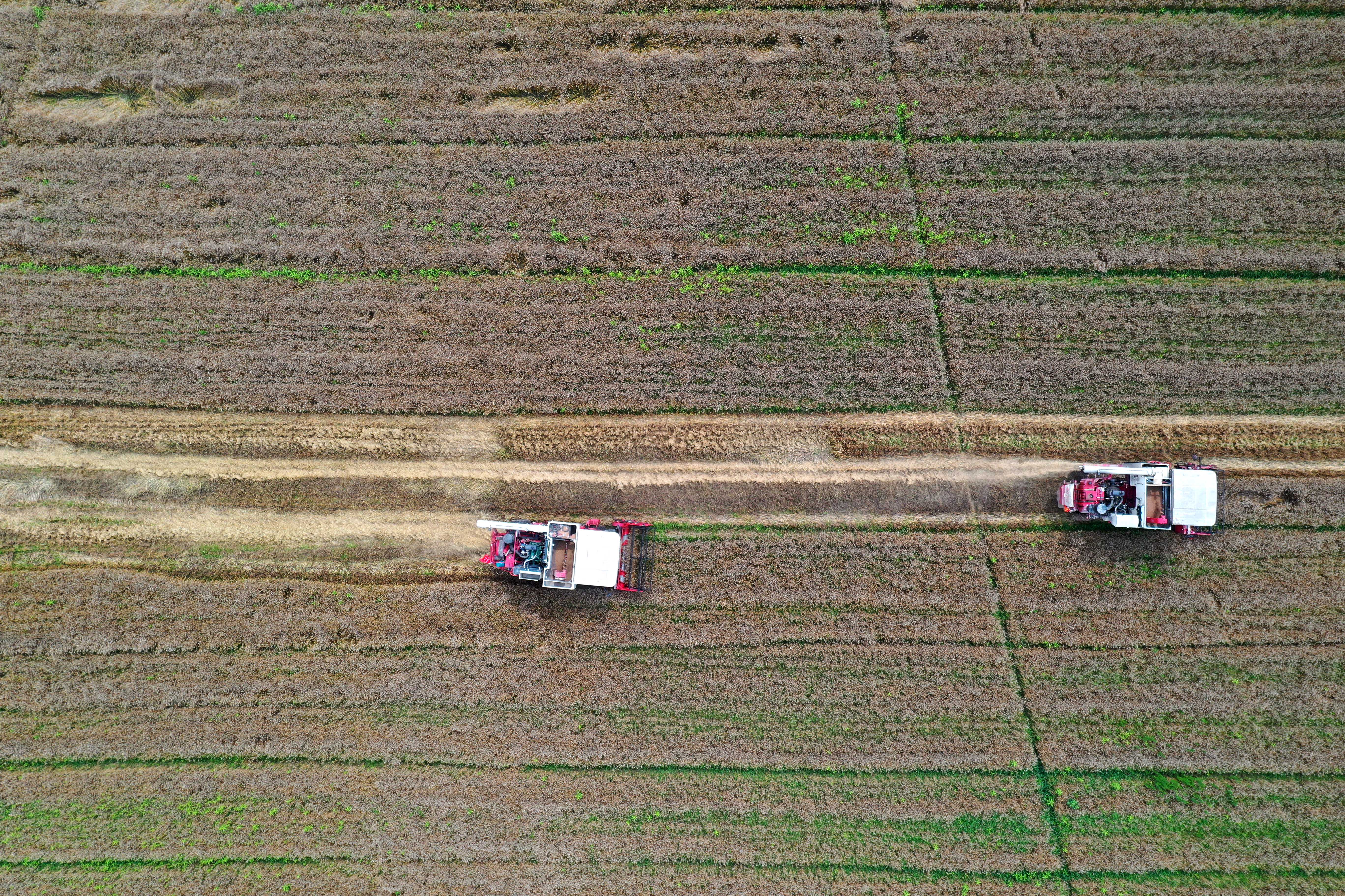 2021年6月1日,在合肥市蜀山区小庙镇段冲村,农机手操作机械设备收割小麦(无人机照片)。新华社记者 刘军喜 摄