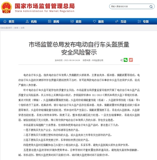 中国网6月4日讯 据国家市场监督管理总局网站消息,电动自行车头盔,指供电动自行车驾乘人员佩戴的头部装具,主要由壳体、缓冲层、佩戴装置等组成。电动自行车头盔的关键部件存在质量问题或使用不当时,有可能导致电动自行车事故中头盔无法保护头部,造成严重的人身伤害。