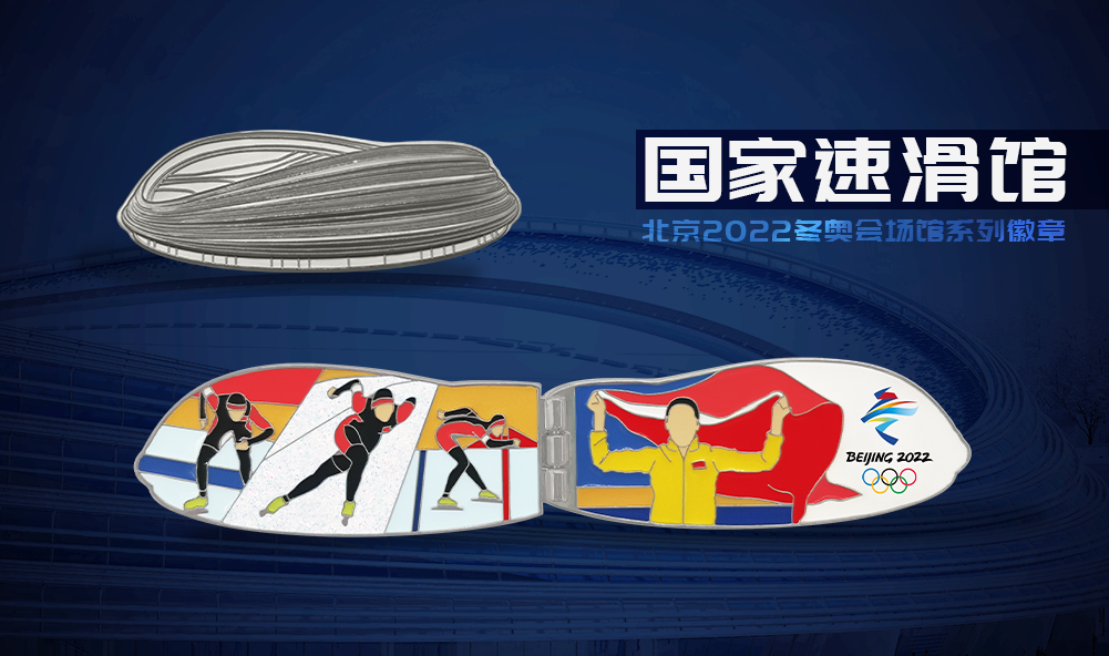“冰丝带”作为场馆系列徽章的第六枚,以国家速滑馆为设计原型,外形优雅大方,采用仿珐琅、葱粉、印刷等工艺,可打开、折合。打开后的画面描述了速度滑冰这项运动从起跑、滑行到冲线的全过程。