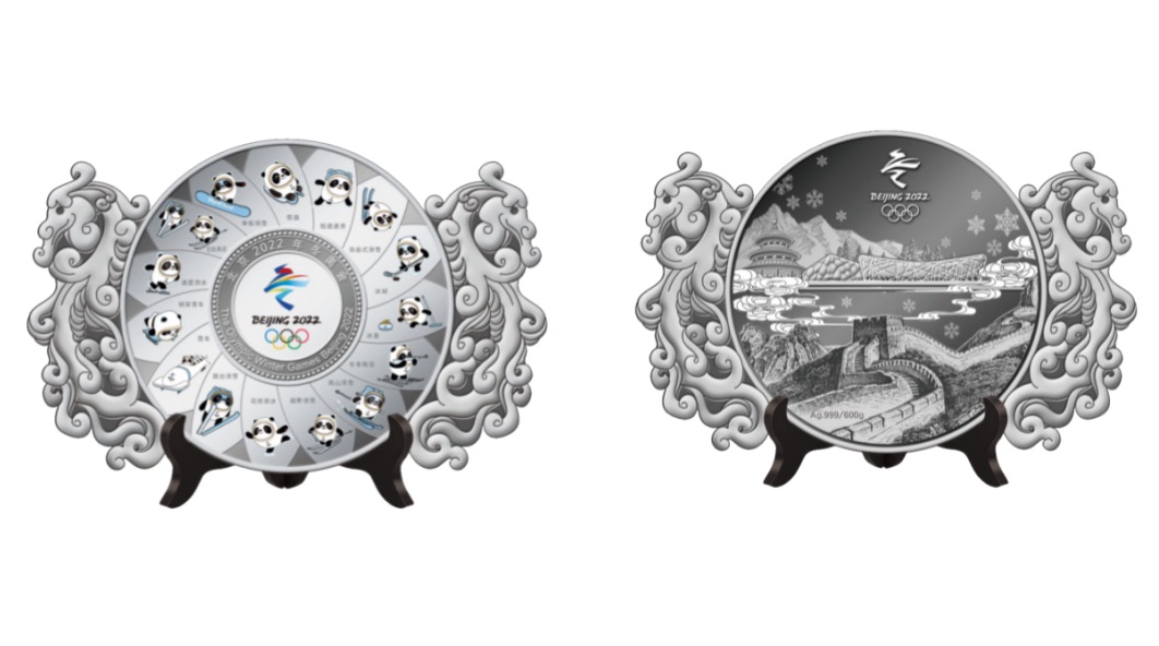“筑梦冬奥”大银章,左右两侧为浮雕龙纹,与中间的北京2022年冬奥会吉祥物“冰墩墩”的15个运动造型图案相结合;背面由长城、天坛、鸟巢、水立方组合而成,上方为北京冬奥会会徽。徽章整体设计既弘扬了中国传统文化,又表现了冬奥会主题。