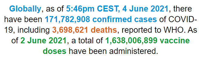 根据世卫组织最新实时统计数据,截至欧洲中部夏令时间6月4日17时46分(北京时间6月4日23时46分),全球累计新冠肺炎确诊病例171782908例,累计死亡病例3698621例。6月4日全球新增新冠肺炎确诊病例477334例,新增死亡病例10909例。(总台记者 朱赫)
