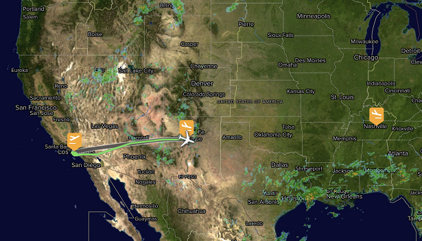 △飞机航线图,中间为阿尔伯克基机场,右侧黄色标志为纳什维尔