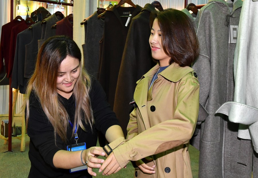 顾客在藏博会上试穿当地产的服装(2018年9月8日摄)。新华社记者 觉果摄