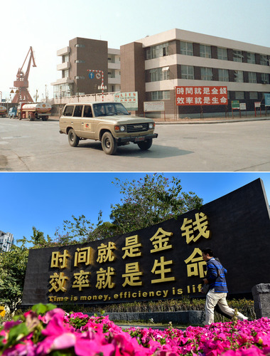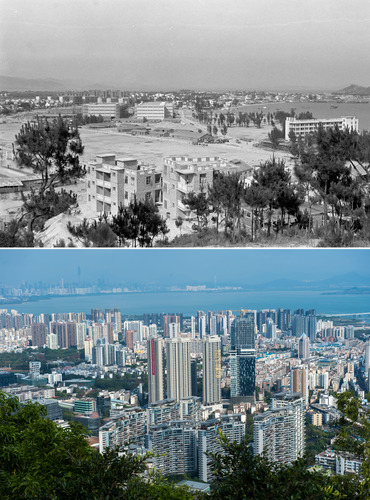 蛇口工业区今昔对比。(上图新华社记者李长永摄;下图新华社记者毛思倩摄)