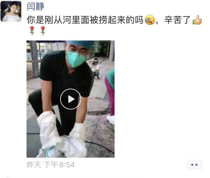 同在广州市红十字会医院工作的妻子闫静看到视频后,发朋友圈调侃道:“你是刚从河里面被捞起来的吗”