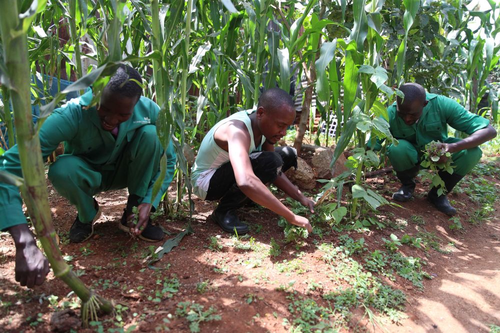 6月2日,弗雷德里克·奥金达(右一)与同伴在菜园中除草。新华社记者龙雷摄