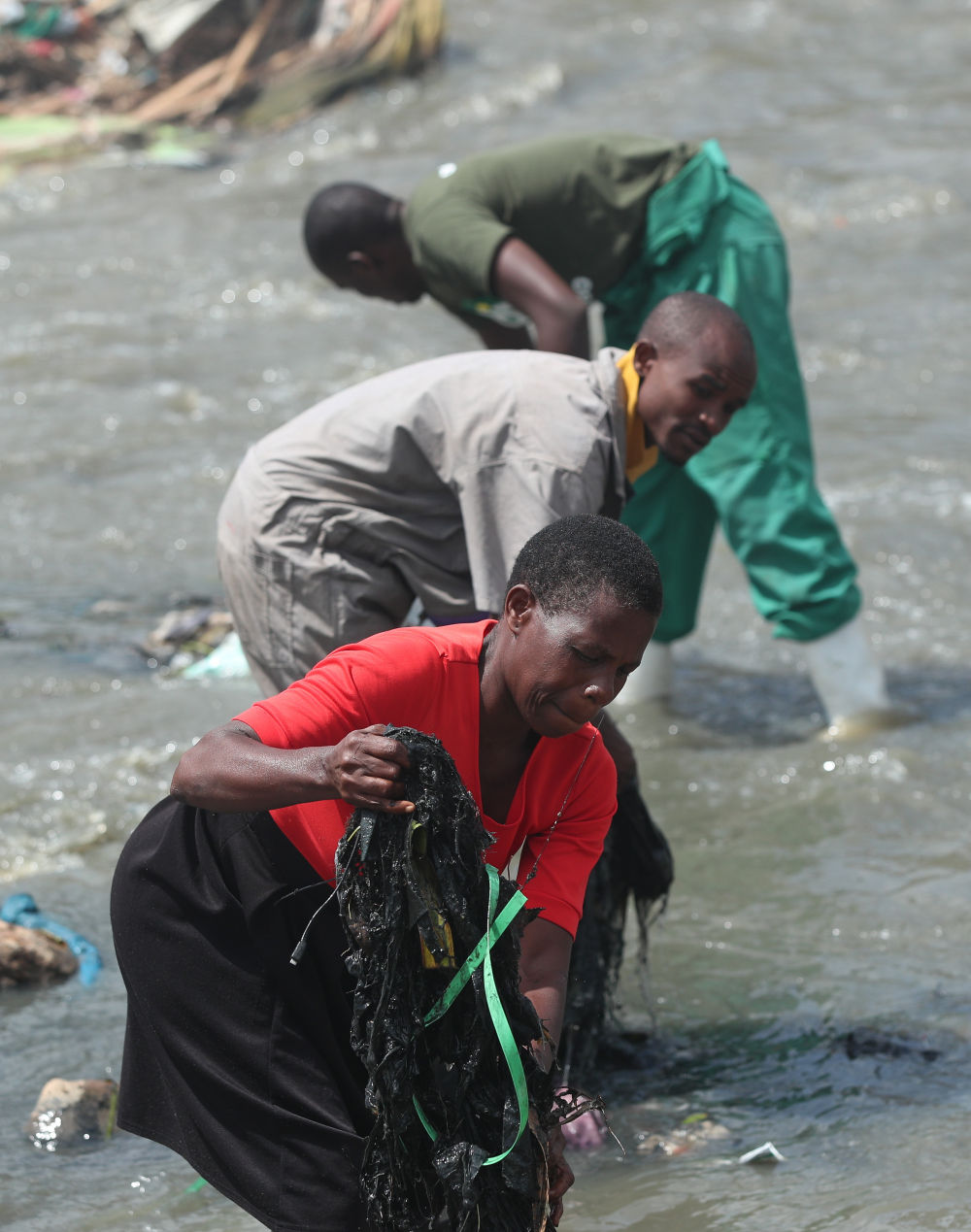 6月2日,玛丽·阿金伊与同伴清理河水中的垃圾。新华社记者龙雷摄