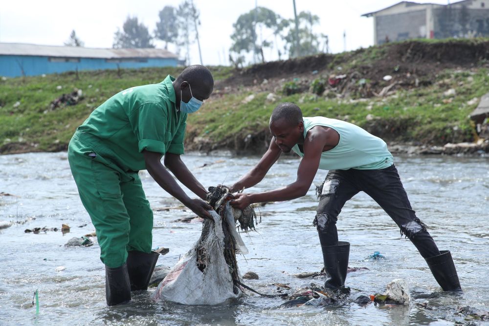 6月2日,弗雷德里克·奥金达(左)与同伴一同清理河水中的垃圾。新华社记者龙雷摄
