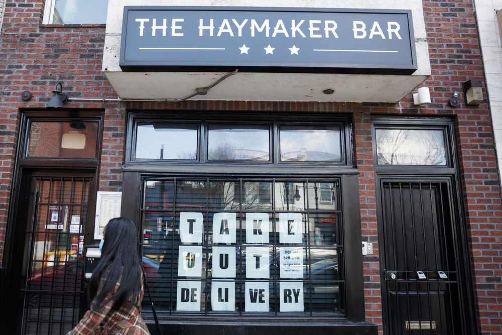 4月2日,在美国华盛顿,一名女子从酒吧前走过。(新华社发,沈霆摄)