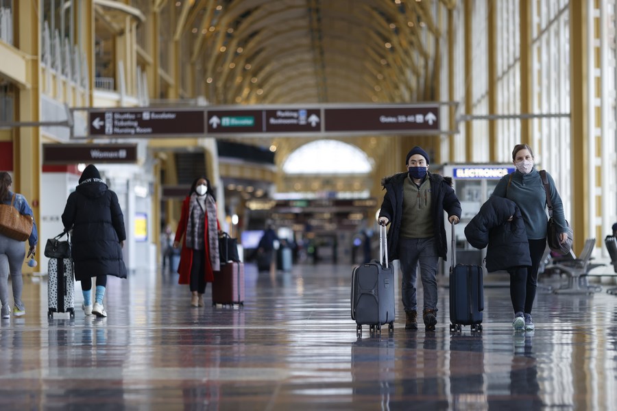 2月2日,在美国弗吉尼亚州阿灵顿的罗纳德·里根华盛顿国家机场,旅客戴着口罩走在航站楼内。(新华社发,沈霆摄)