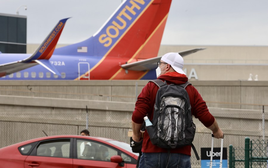 2月1日,旅客佩戴口罩在美国洛杉矶国际机场等待乘车。(新华社发)