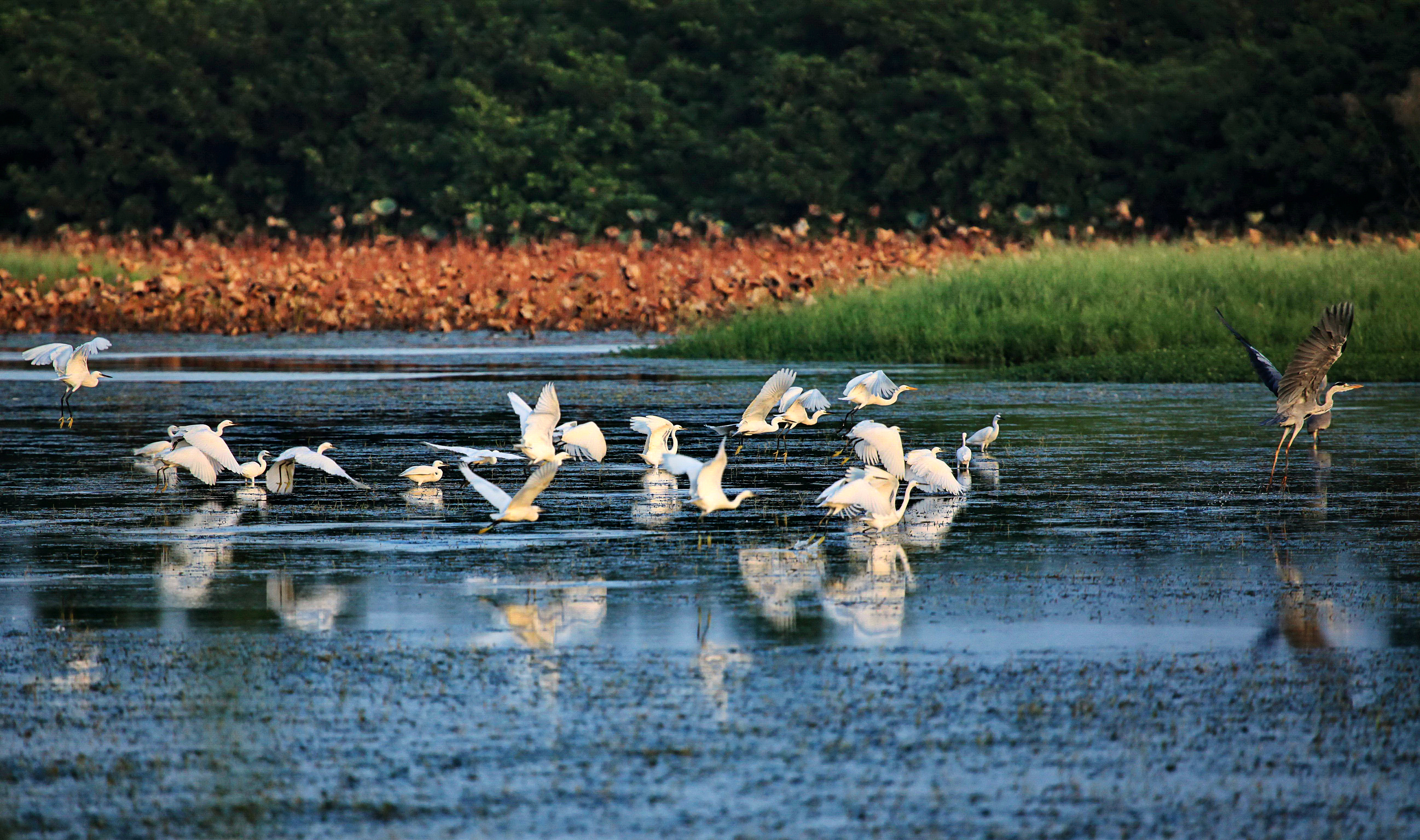 广州市一湿地公园内成群的鹭鸟在翩飞。(广州市林业和园林局供图)