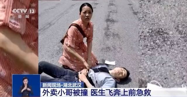 近日,湖北武汉一名外卖小哥在路口被汽车撞倒在地,昏迷不醒。危急时刻,附近一位女士飞奔上前,对他展开救治。