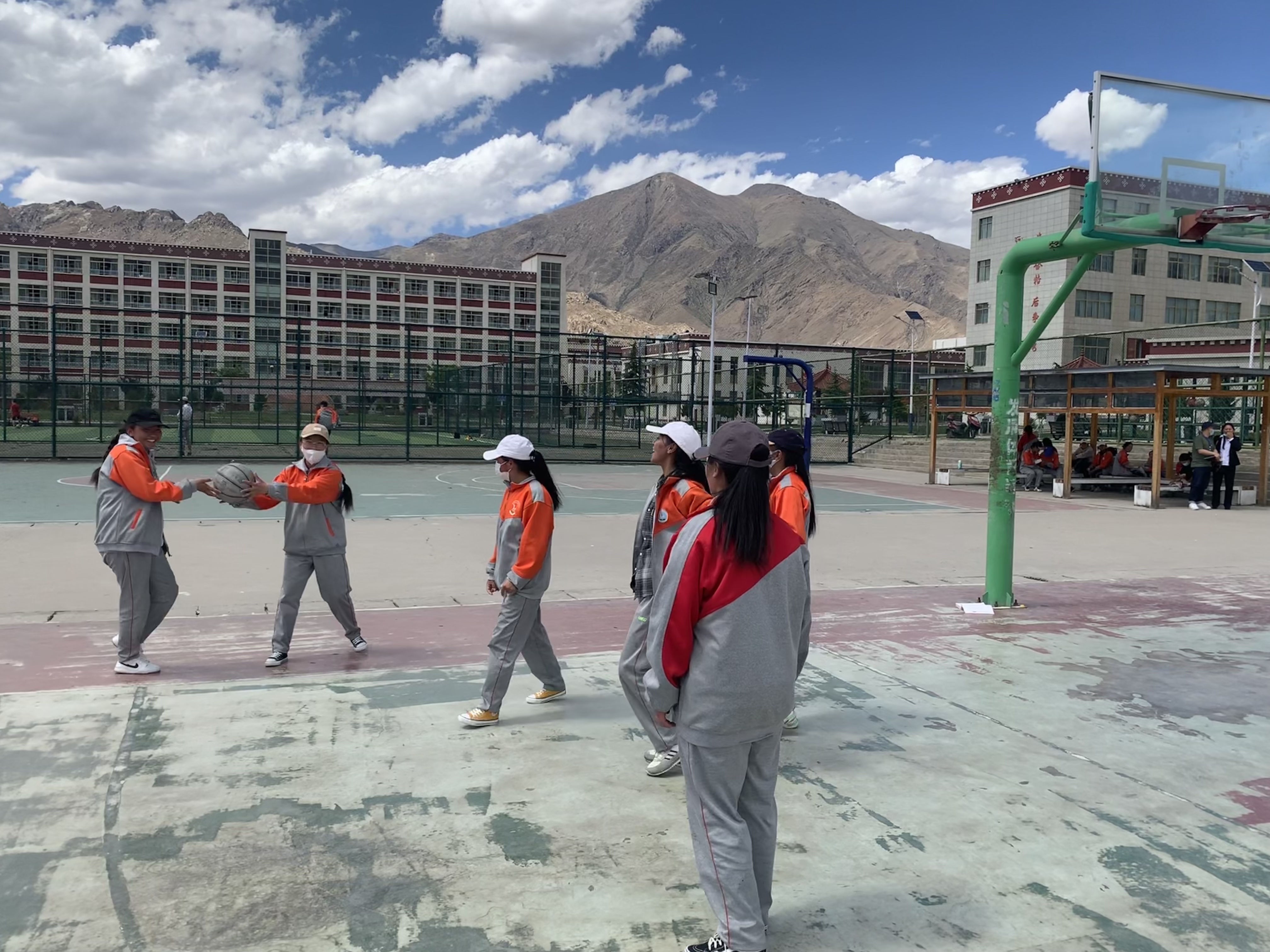 6月1日,西藏自治区拉萨市,拉萨那曲第二高级中学女学生们在操场打篮球。新华社记者齐菲摄