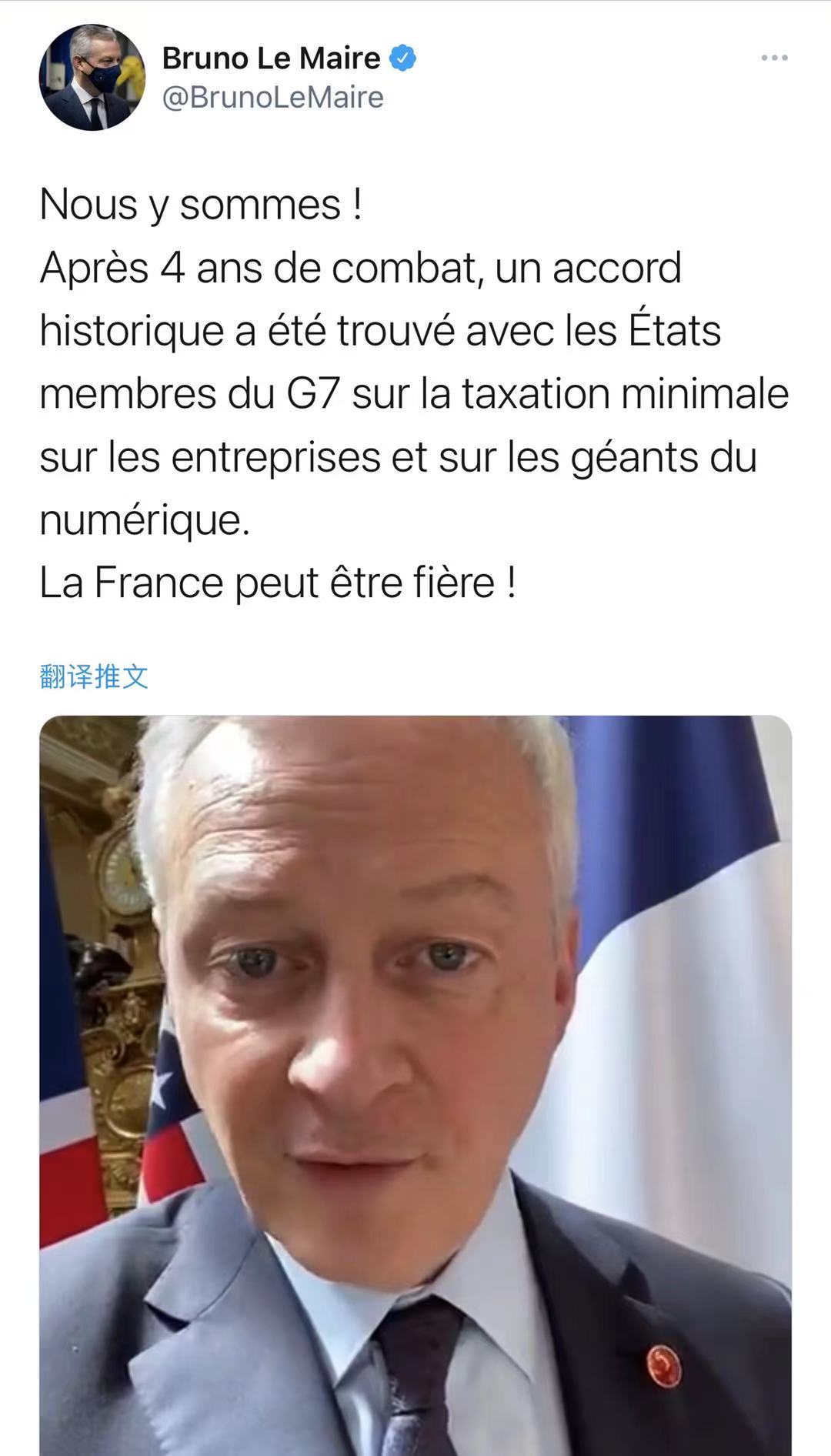勒梅尔在其社交媒体账户上表示,经过4年的艰苦谈判,七国集团成员国就对跨国企业和大型数字科技公司征收最低税率达成了历史性协议,法国对此感到骄傲。