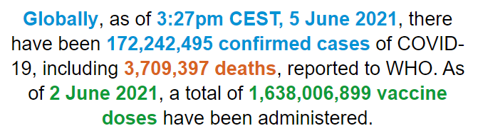 根据世卫组织最新实时统计数据,截至欧洲中部夏令时间6月5日15时27分(北京时间6月5日21时27分),全球累计新冠肺炎确诊病例172242495例,累计死亡病例3709397例。5日全球新冠肺炎确诊病例新增449332例,死亡病例新增10714例。(总台记者 朱赫)