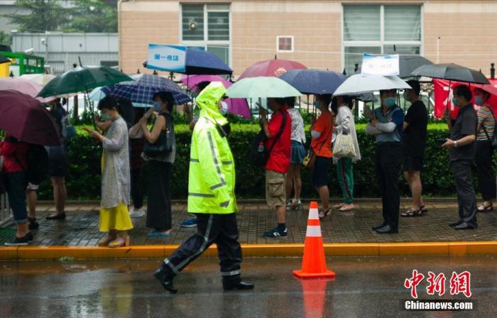 资料图:2020年7月9日,北京中关村中学考点外,家长在雨中等待考生出考场。 中新社记者 盛佳鹏 摄
