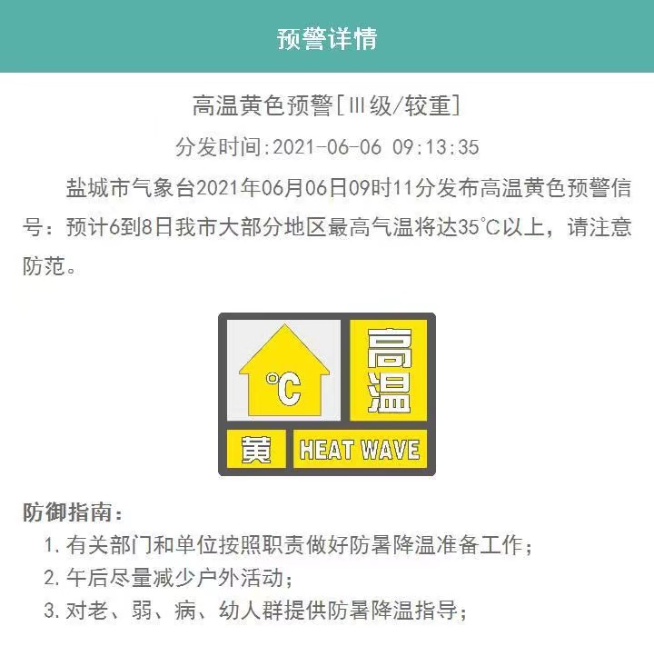 江苏省盐城市气象台6月6日9时11分发布高温黄色预警信号:预计6日到8日盐城市大部分地区最高气温将达35℃以上,请注意防范。