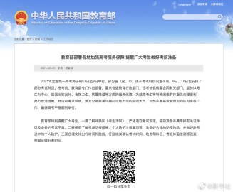 #高考明日拉开帷幕# 【#教育部发布高考前提醒#】2021年全国统一高考将于6月7日至8日举行,部分省(区、市)9日、10日也安排了部分考试科目。记者6日从教育部了解到,教育部专门就高考服务保障作出部署,并特别提醒广大考生,了解并熟知考生须知,严格遵守考试规定,提前准备并携带好有关证件以及必备的考试用具。要提前了解考场防疫措施、个人防护注意事项等,准备好合规的防疫物品,并做好赴考途中的个人防护。要合理安排出行时间和路线,仔细核实确认考试时间、地点和科目,考虑体温检测等因素,预留足够赴考时间。#关注2021高考#(记者胡浩)
