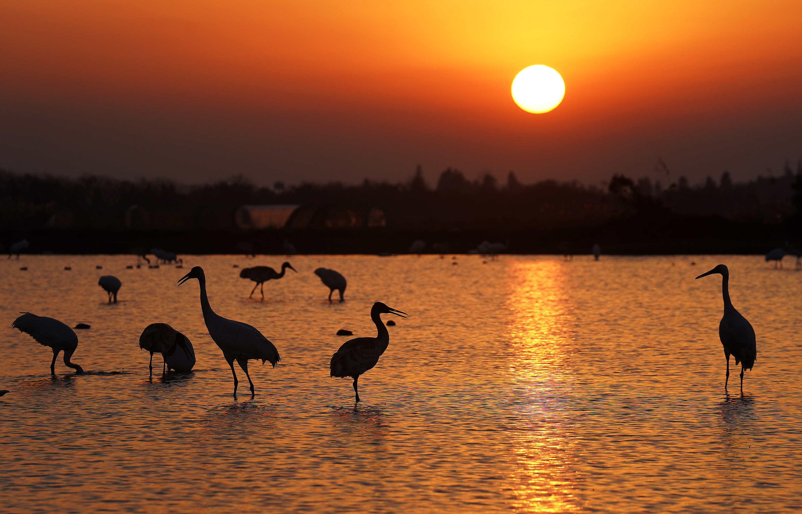 白鹤在位于鄱阳湖湖区的南昌五星白鹤保护小区的湿地中栖息。(2020年12月21日摄)新华社记者 万象摄